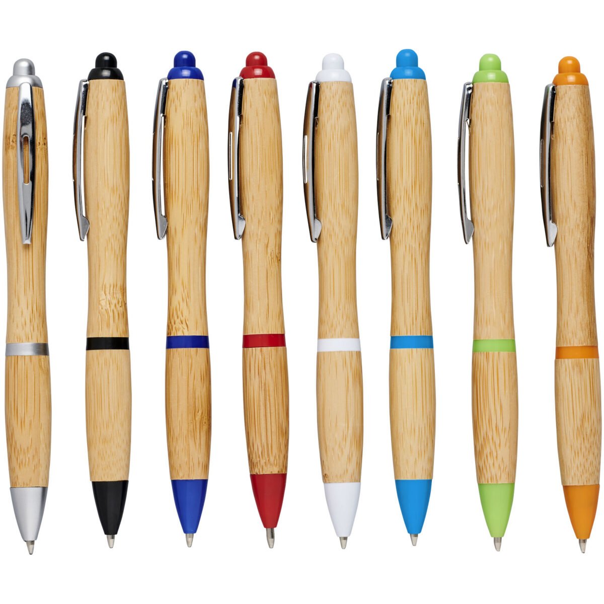 Stylo bille rétractable avec corps en bambou, rehaussé par une agrafe chromée et des finitions en plastique ABS. La couleur du bambou peut varier.