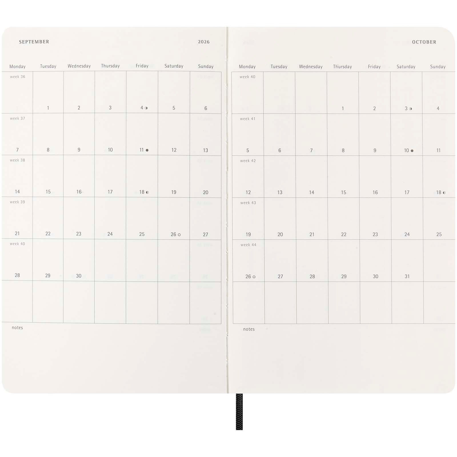Planifiez chaque journée dans les moindres détails avec l’agenda quotidien Moleskine de 12 mois à couverture souple. Daté de janvier à décembre 2026, la mise en page de cet agenda permet d’afficher une journée entière par page afin de disposer de beaucoup d’espace pour noter les événements, les rendez-vous, les choses à faire, les rappels et les projets. Tout au long de l’année, il s’étoffe pour garder la trace de tout ce qui a été accompli, jour après jour. Il est doté d’un papier ivoire sans acide, d’un élastique de fermeture noir, d’un marque-page, d’une pochette intérieure extensible de couleur assortie et d’autocollants pour la personnalisation, ainsi que d’autocollants de l’année pour le dos.