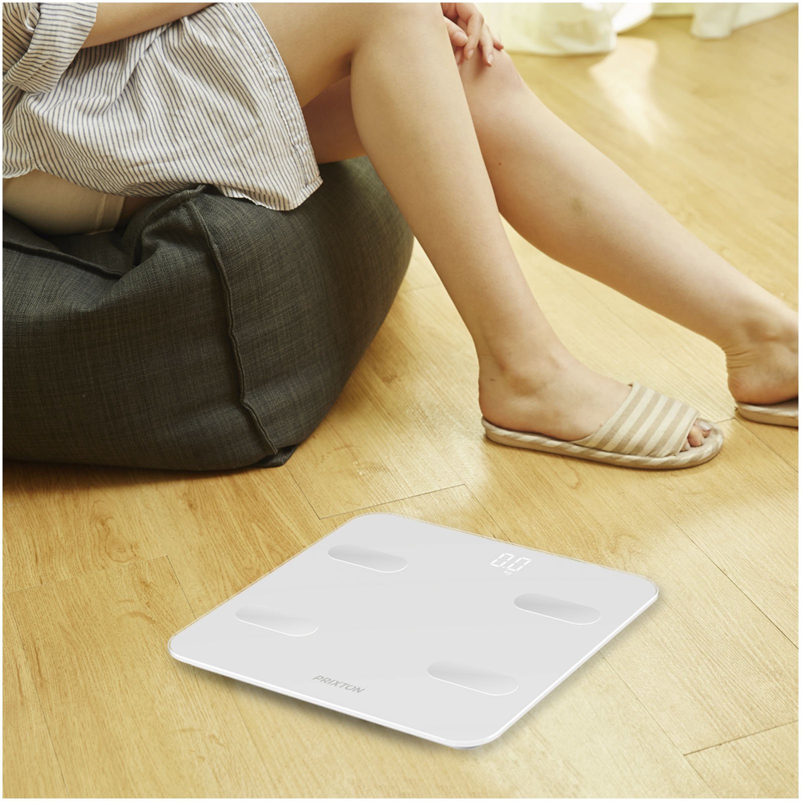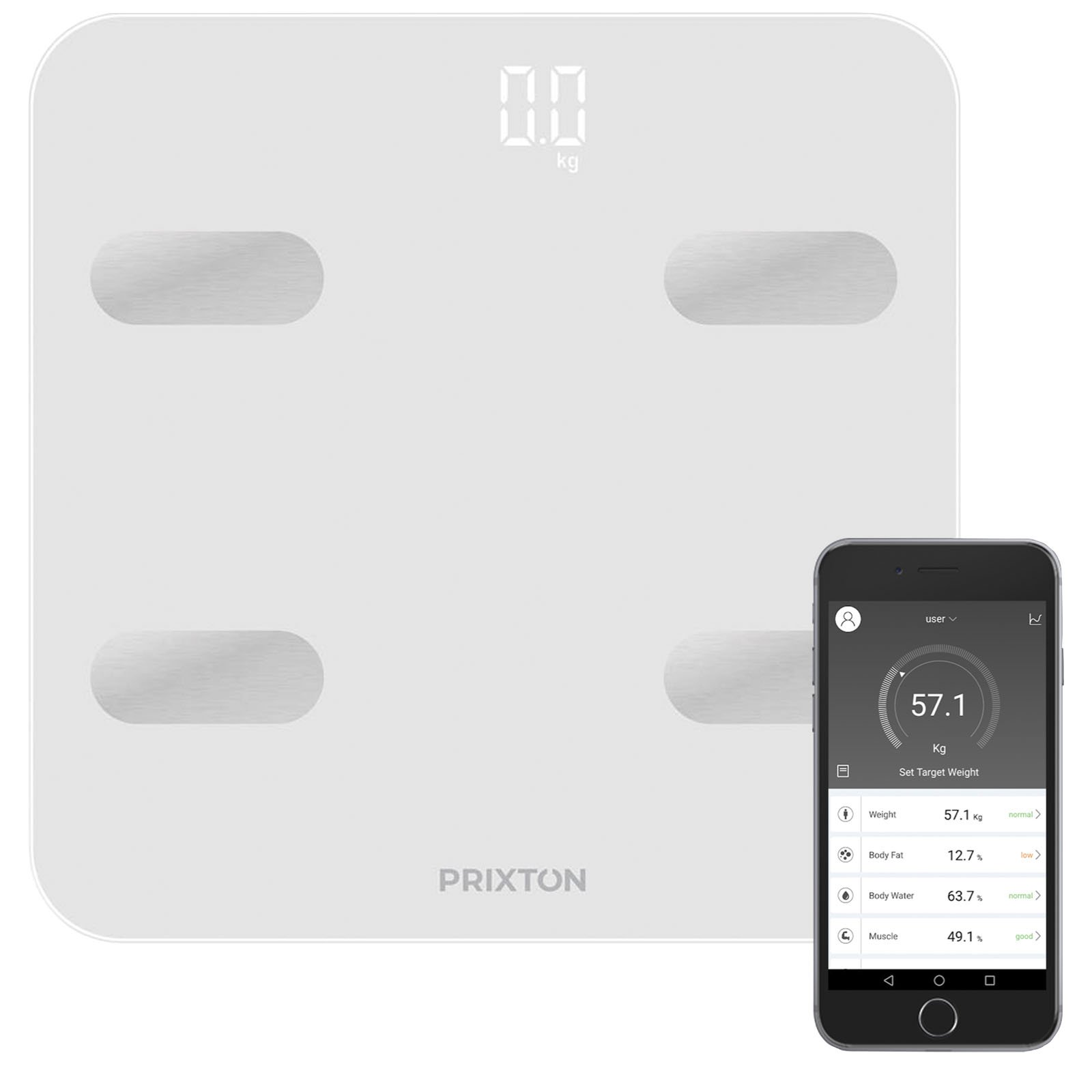 Balance avec 13 fonctions pour le suivi des données via une application : taux de graisse corporelle, taux hydrique, pourcentage de muscle, masse osseuse, métabolisme de base, IMC, graisse viscérale, poids standard, contrôle du poids, masse graisseuse, masse maigre. L’application montre le poids en kilogrammes et en livres. Bluetooth intégré. Écran LCD blanc. Batterie AAA. Poids maximum 180 kg.