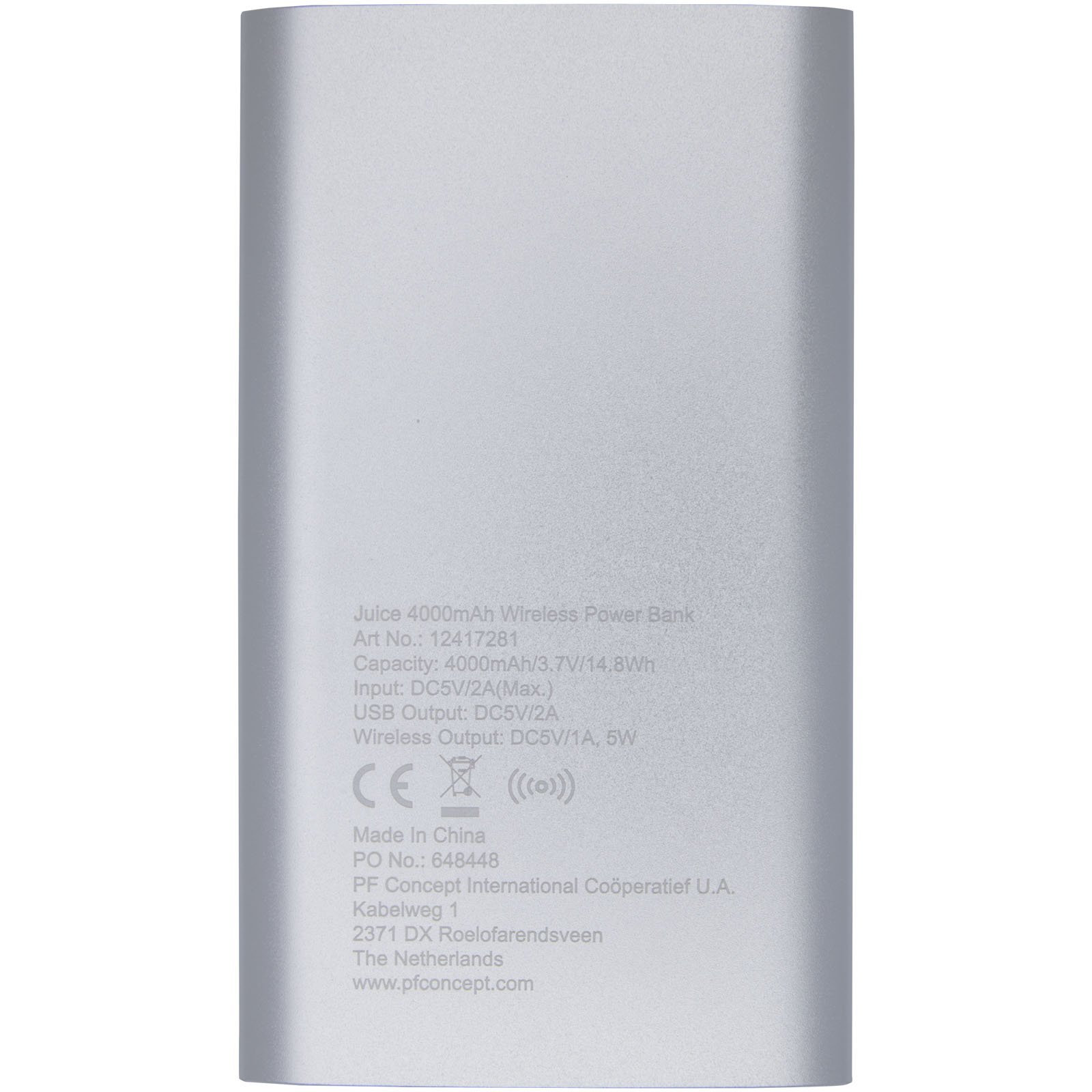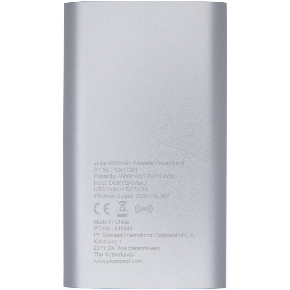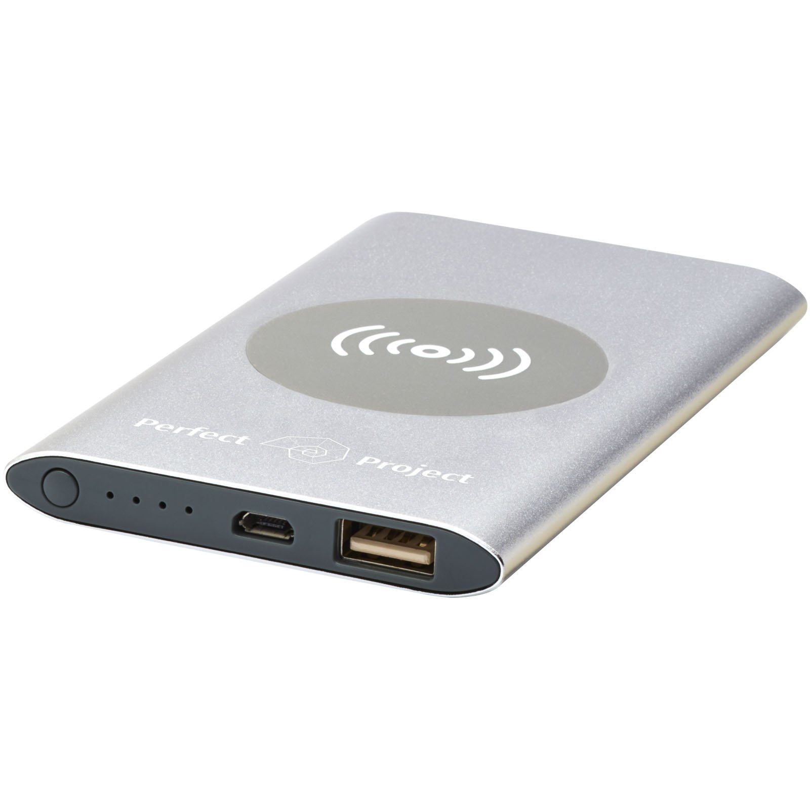 Batterie de secours de 4 000 mAh avec boîtier en aluminium. Permet une recharge sans fil de 5 W et est également dotée d’une sortie Micro USB pour permettre la recharge par câble. Grâce à sa batterie lithium-polymère de 4 000 mAh, elle peut recharger entièrement un smartphone. Indicateur de puissance qui indique le niveau d’énergie à tout moment. Port Micro USB intégré : Entrée 5 V/2 A Sortie: 5 V/2A. Sortie sans fil 5 W. Câble de chargement en plastique TPE sans PVC inclus. Livré dans un coffret cadeau standard.