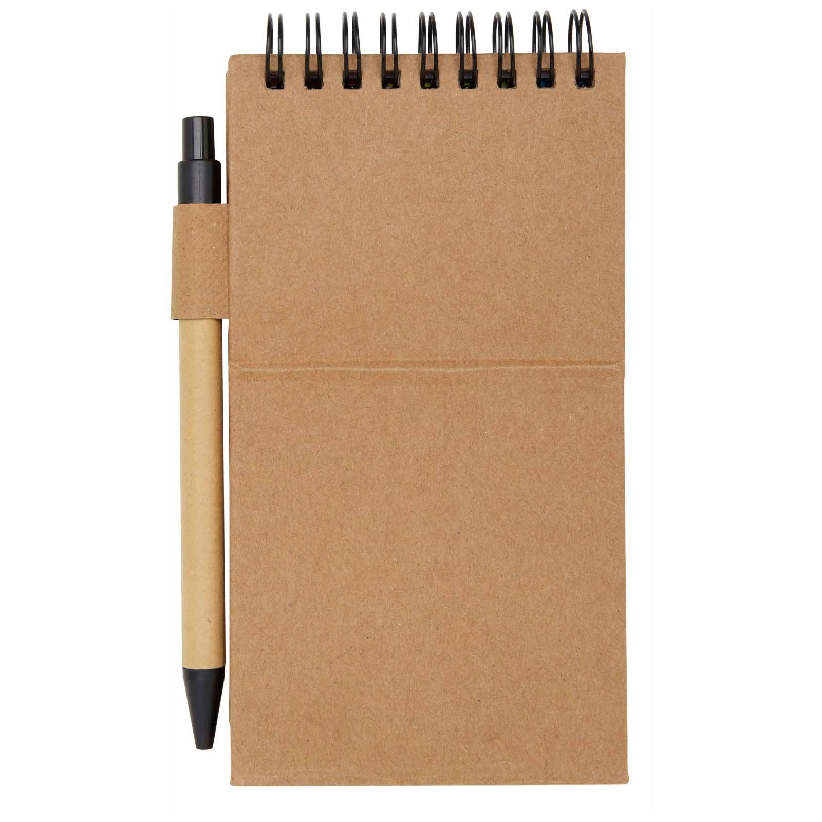 Bloc-notes autocollant avec stylo bille. Le bloc-notes comporte 30 feuilles de papier blanc ligné de 70 g/m2 (8 x 12 cm). Il contient également 25 notes autocollantes multicolores (5 x 1,2 cm) et 25 notes autocollantes jaunes (7,5 x 7,5 cm), toutes deux en papier de 70 g/m2. Le corps du stylo bille est en papier recyclé. Couleur de l’encre : Noire. Longueur d’écriture : 1000 mètres. Taille de la plume : 1,00 mm.