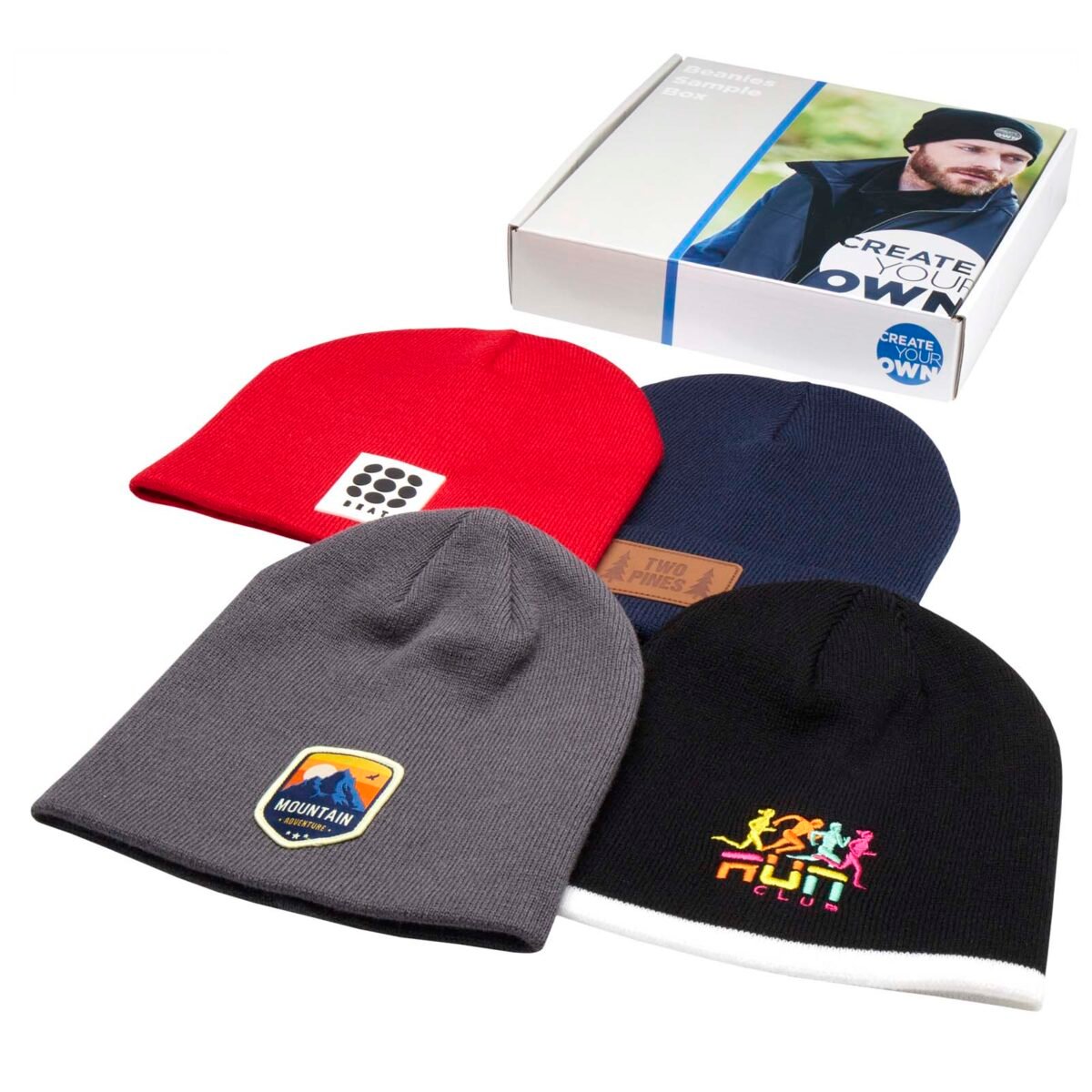 Boîte d’échantillons de bonnets comprenant 3 bonnets de styles différents : 1 bonnet double épaisseur avec rebord, 1 bonnet double épaisseur avec garniture et 1 bonnet double épaisseur à 6 coutures.