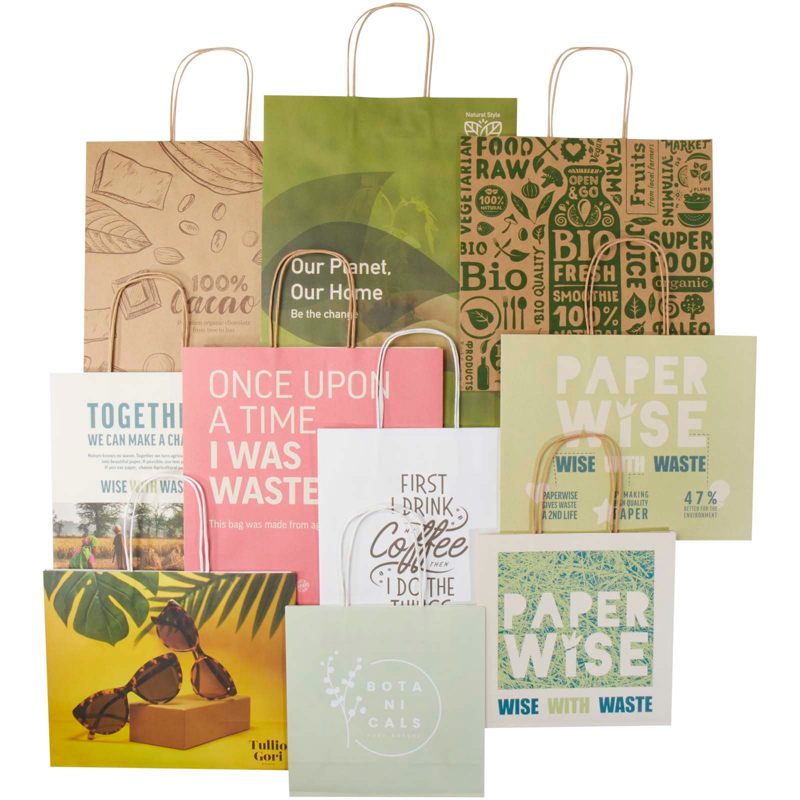 Boîte d’échantillons avec 10 sachets en papier. 5 sachets sont fabriqués à partir de déchets agricoles et les 5 autres à partir de papier Kraft. Les deux types de sacs sont disponibles en 5 tailles différentes (24 x 9 x 24 cm, 24 x 9 x 32 cm, 31 x 12 x 25 cm, 31 x 12 x 31 cm, 31 x 12 x 41 cm). Fabriqué en Europe.