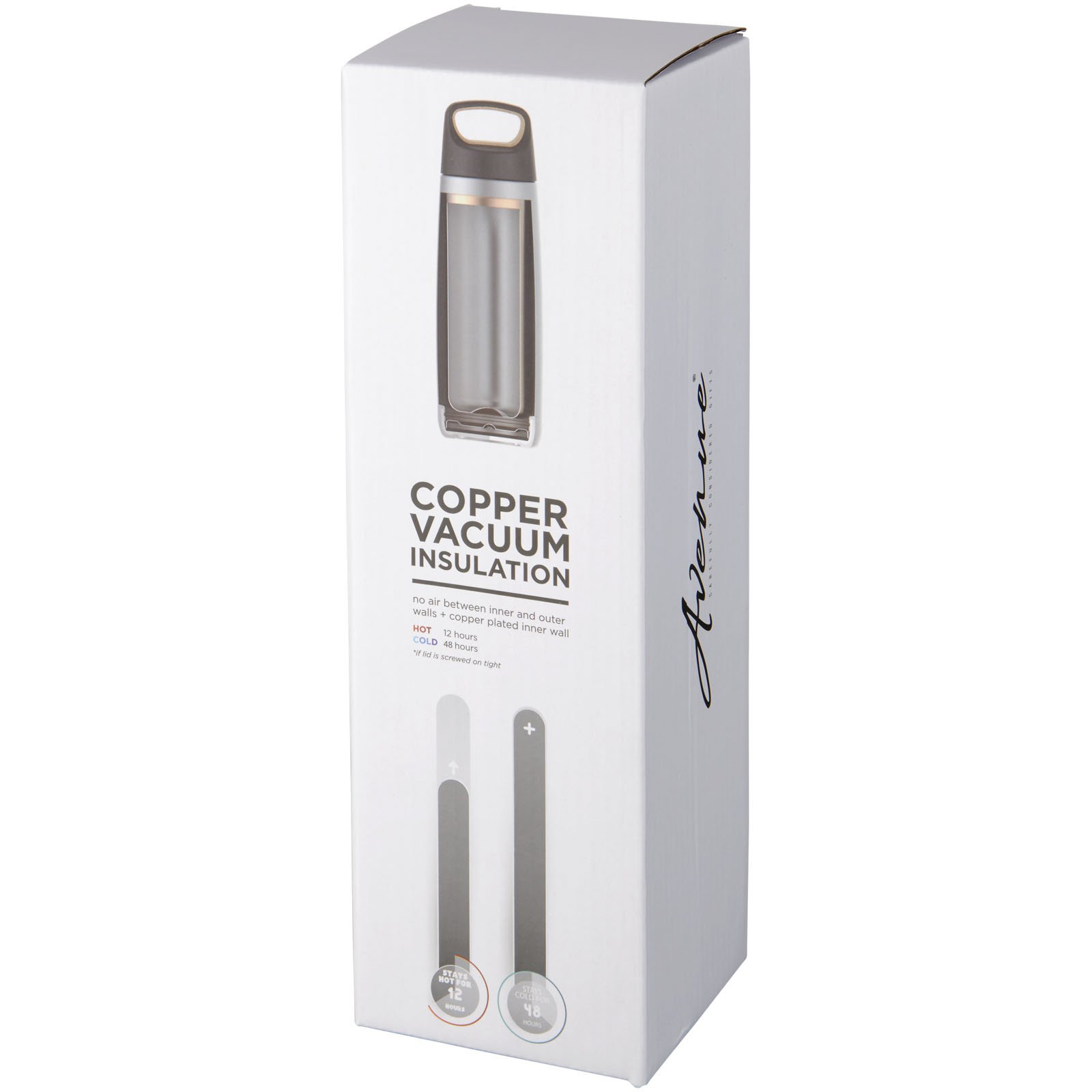 Design sous vide en acier inoxydable à double paroi résistante avec isolation en cuivre, ce qui permet à votre boisson de rester froide pendant 48 h et chaude pendant au moins 12 h. Le design empêche également la formation de condensation à l’extérieur de la bouteille. Couvercle à visser avec détails en liège et fond antidérapant. Capacité de 600ml. Présentée dans une boite cadeau Avenue.