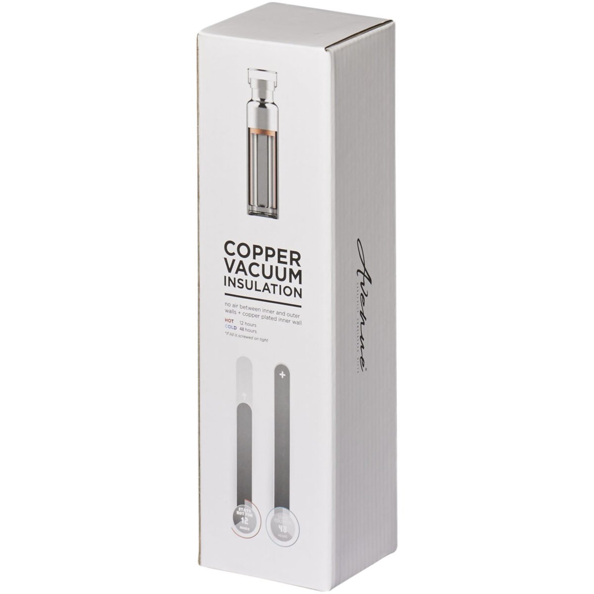 Bouteille en acier inoxydable avec isolation par le vide et placage en cuivre, ce qui vous permet de conservez vos boissons chaudes pendant 12 heures ou froides pendant 48 heures. La construction évite la condensation sur l’extérieur de la bouteille. Revêtement tendance et durable. Couvercle vissé en acier qui évite les écoulements et passant en acier. Large ouverture pour une utilisation plus agréable. Parfaite pour glisser des cubes de glace. Capacité : 650 ml. Sous coffret cadeau Avenue.