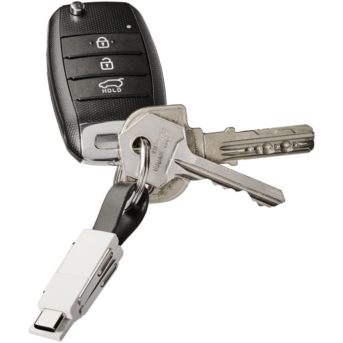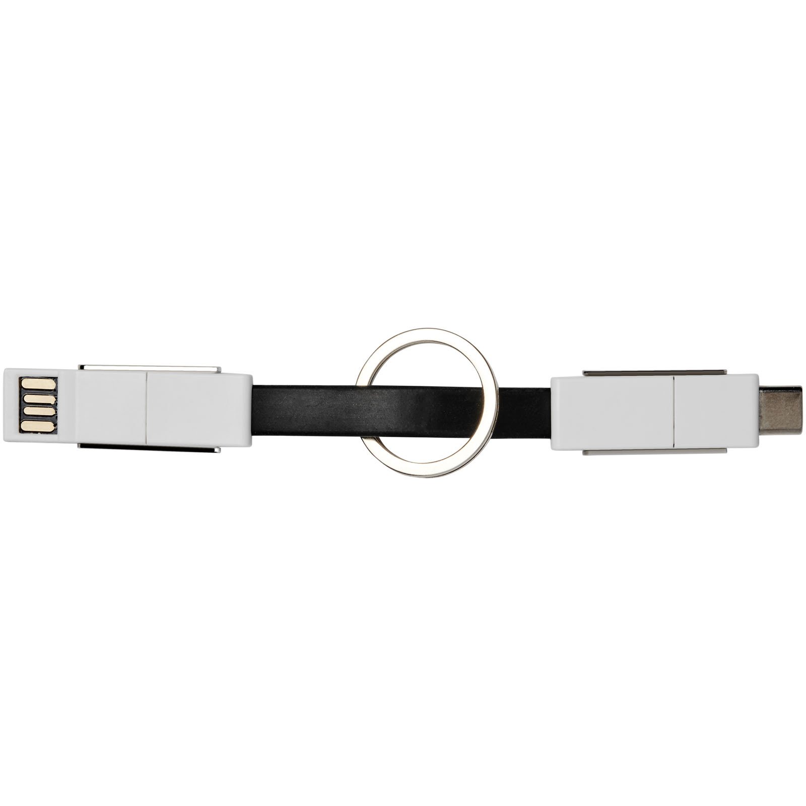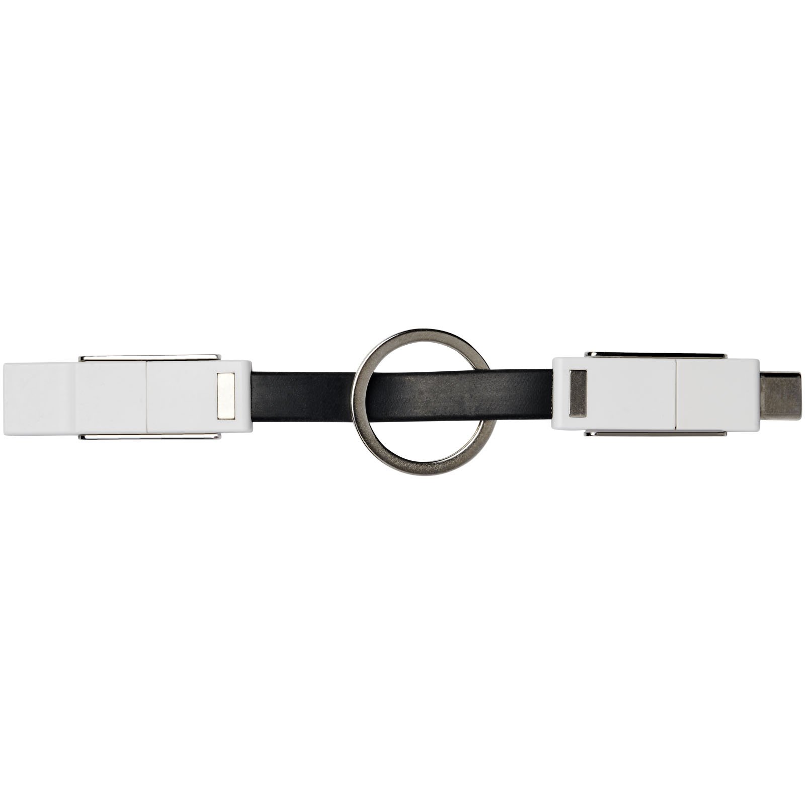 Un câble 4 en 1 pour répondre à tous les besoins de charge avec un seul article. Inclut un USB type A, un type C et un embout 2 en 1 compatible avec les appareils iOS et Android. Il peut être utilisé pour la charge et le transfert de données. Livré avec un porte-clés et des aimants pour un transport pratique.