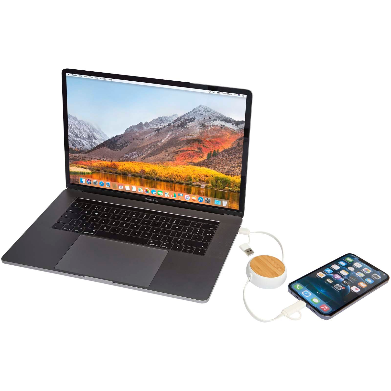 Le câble rétractable 5-en-1 de synchronisation des données et de charge rapide 45 W Chechia est fabriqué à partir de plastique recyclé rehaussé de bambou provenant de sources responsables. Ce câble est doté de connecteurs d’entrée USB-A et Type-C combinés à un connecteur de sortie 2-en-1 Type-C et combi Lightning/Micro USB. L’USB-C vers l’USB-C fournit une puissance de sortie maximale de 45 W et l’USB-A vers l’USB-C une puissance maximale de 24 W. Toutes les autres options de connexion offrent une puissance maximale de 15 W. Compatible avec CarPlay et Android Auto, il est également doté d’un support de téléphone intégré pour plus de commodité. Que vous soyez à la maison, au bureau ou en déplacement, le câble Chechia offre performance et style dans un ensemble compact. Longueur du câble : 100 cm.