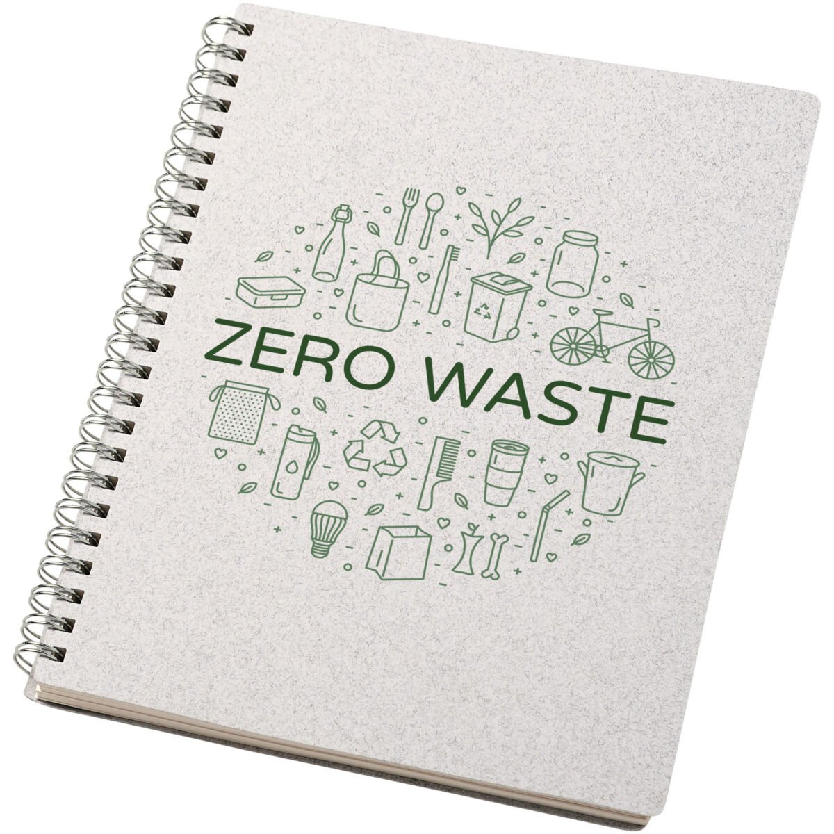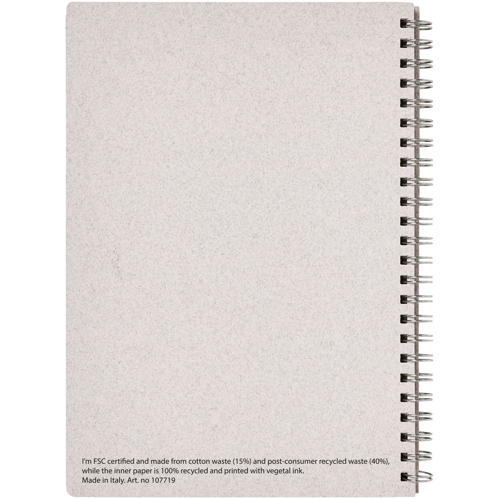 Carnet à spirales au format A5 avec une couverture contenant des matériaux sourcés de manière responsable, soit des déchets de coton (15 %) et des déchets recyclés de post-consommation (40 %). Comprend 80 feuilles, du papier 80 g/m2 100 % recyclé avec grille en pointillés, sourcé de manière responsable. La mise en page en pointillés allie les avantages des pages lignées, unies et quadrillées, offrant une structure et stimulant la créativité simultanément, ce qui rend ce carnet adapté à un large éventail d’utilisateurs. Grâce aux spirales, le carnet peut être posé à plat pour plus de commodité et se plie facilement. Fabriqué en Italie.
