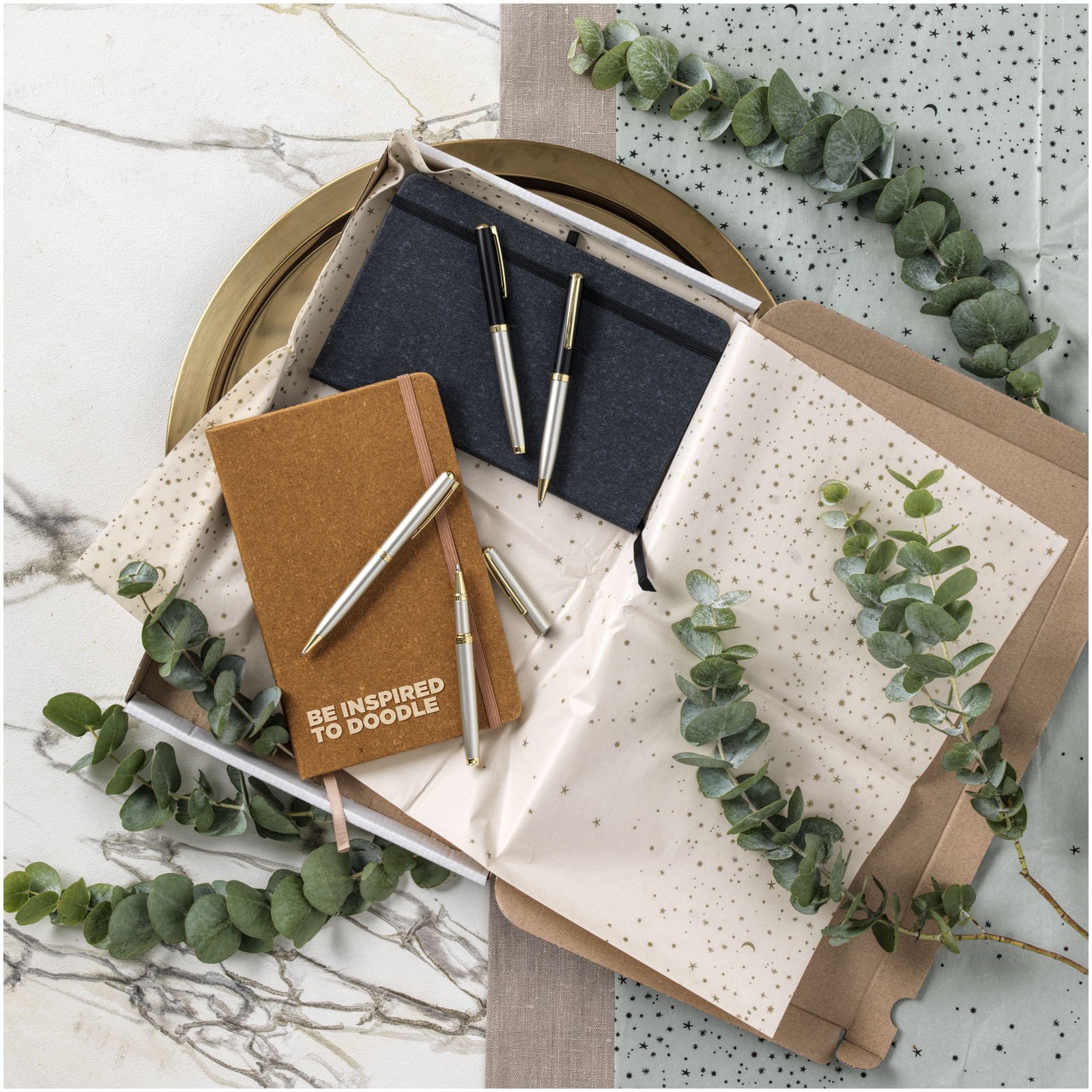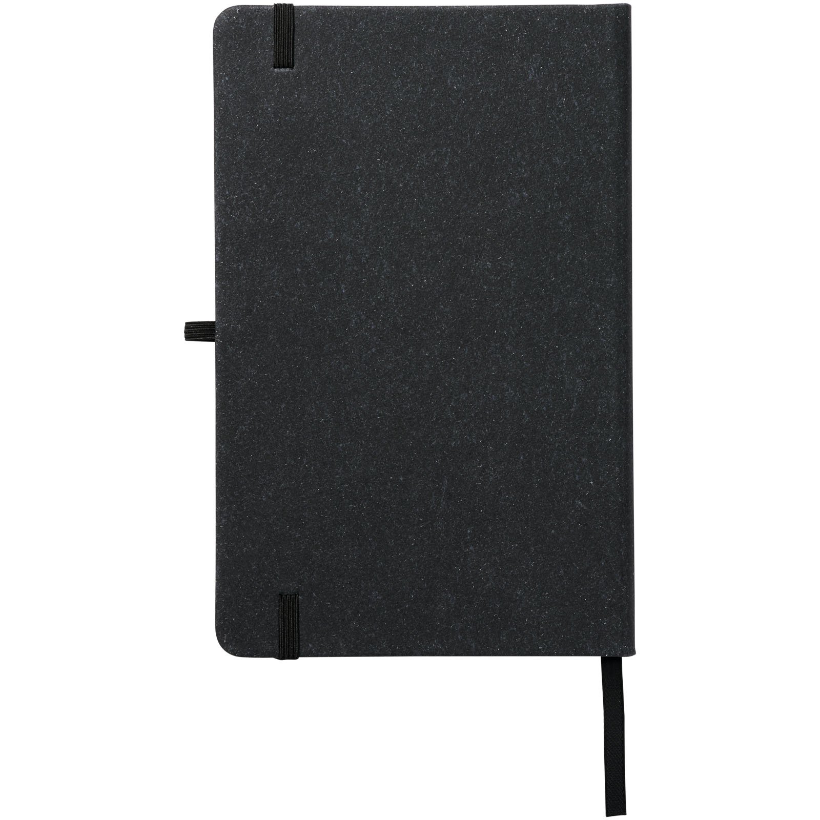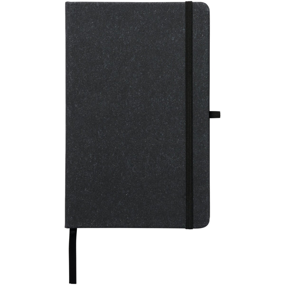 Cahier de référence format A5 avec couverture en chutes de cuir. Comprend une bande élastique, une boucle pour stylo, un marqueur à ruban et 80 feuilles de papier lignées de 80 g/m².