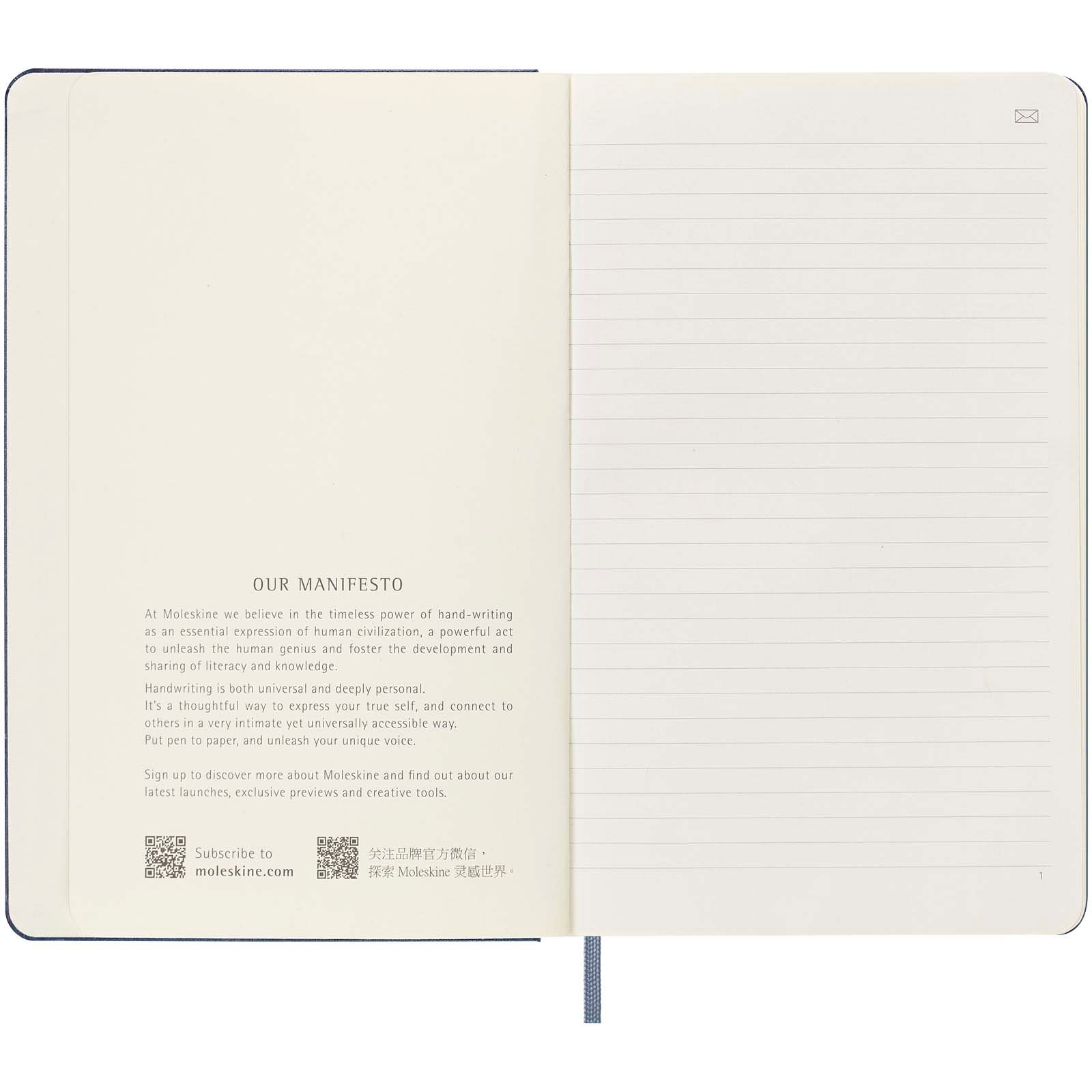 Au cœur de la gamme Smart Writing Set de Moleskine se trouve le Smart Notebook, avec sa forme Moleskine classique et son papier ivoire. Chaque page contient des Ncodes invisibles qui permettent au Smart Pen de créer une copie numérique instantanée de chaque mot et croquis dans l’application Moleskine Notes. Il est doté d’une fermeture élastique, d’un papier lignées sans acide de 100 g/m² de couleur ivoire, d’un papier spécial conçu pour fonctionner avec le Smart Pen de Moleskine, d’un avis « ‘En cas de perte » imprimé sur la page de garde et d’une pochette intérieure extensible au verso.