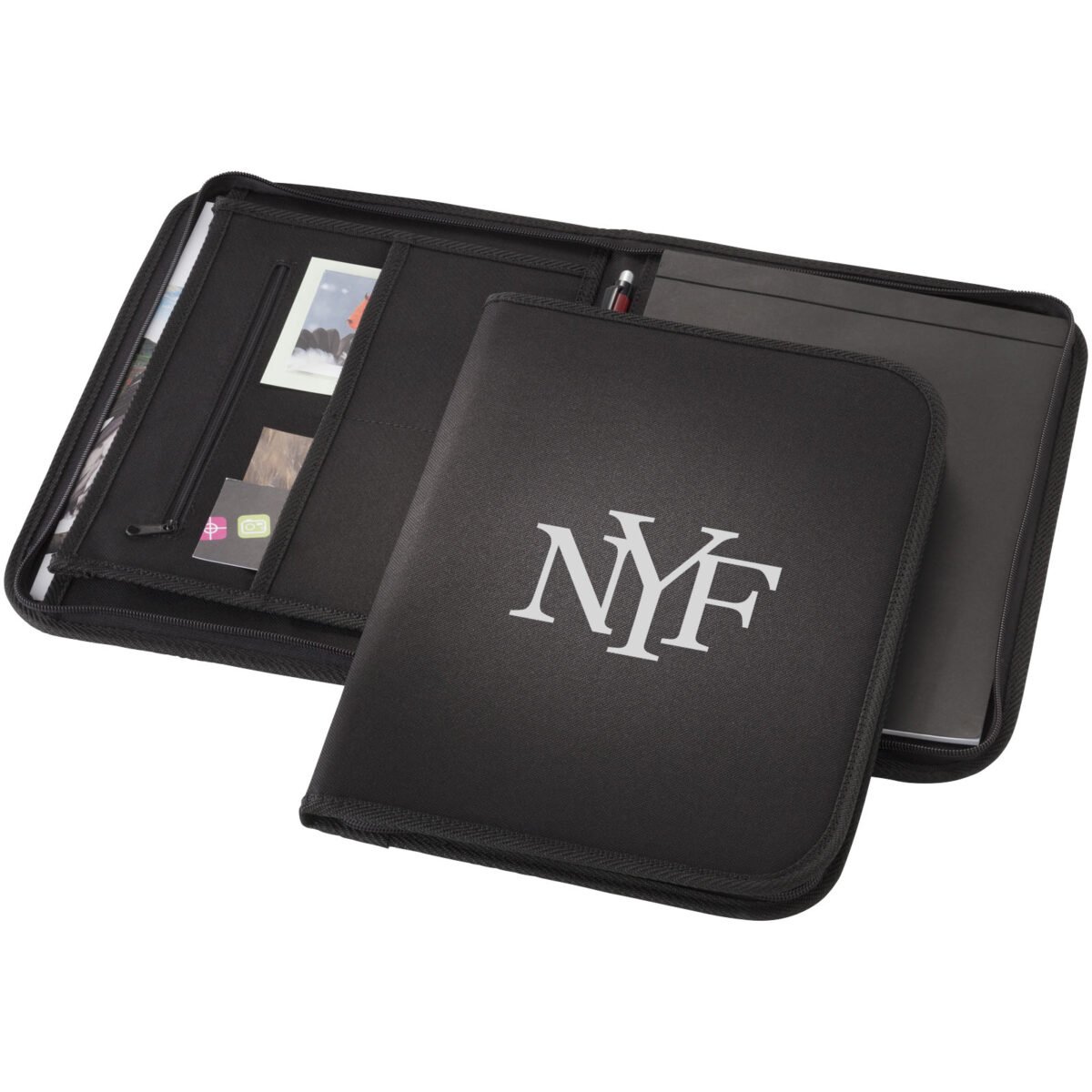 Conférencier avec fermeture zippée, poches pour documents et bloc-notes de 20 pages à lignes. Stylo et accessoires non fournis.