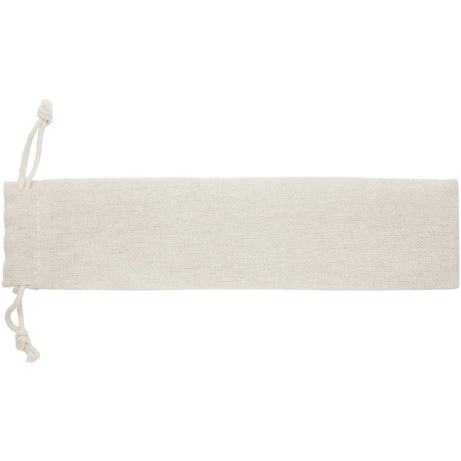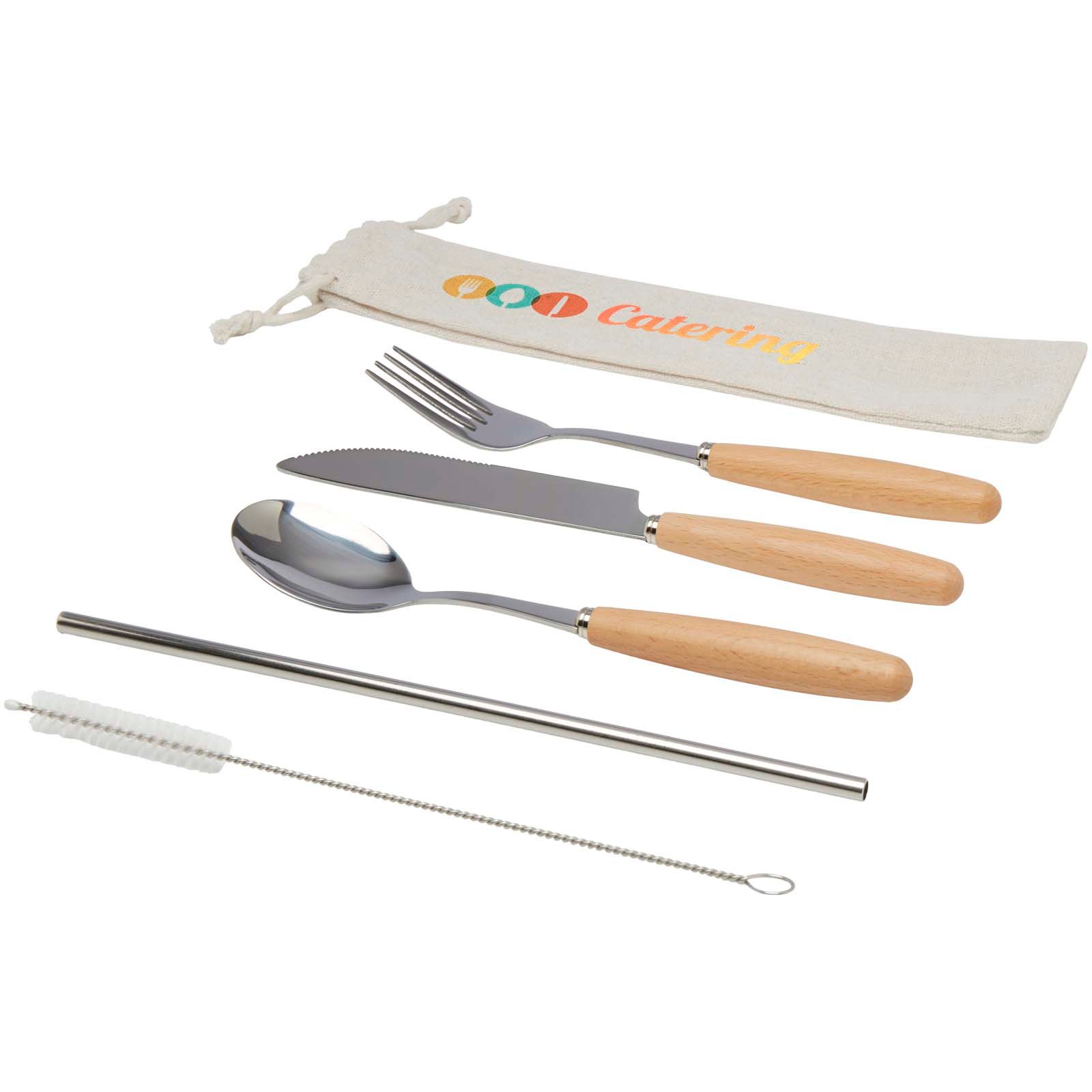 Ensemble de couverts Root comprenant une fourchette, un couteau, une cuillère, une paille et une brosse de nettoyage. Les couverts sont en acier inoxydable, durables et faciles à nettoyer. Les poignées sont en bois de hêtre. Livré dans une pochette en coton.