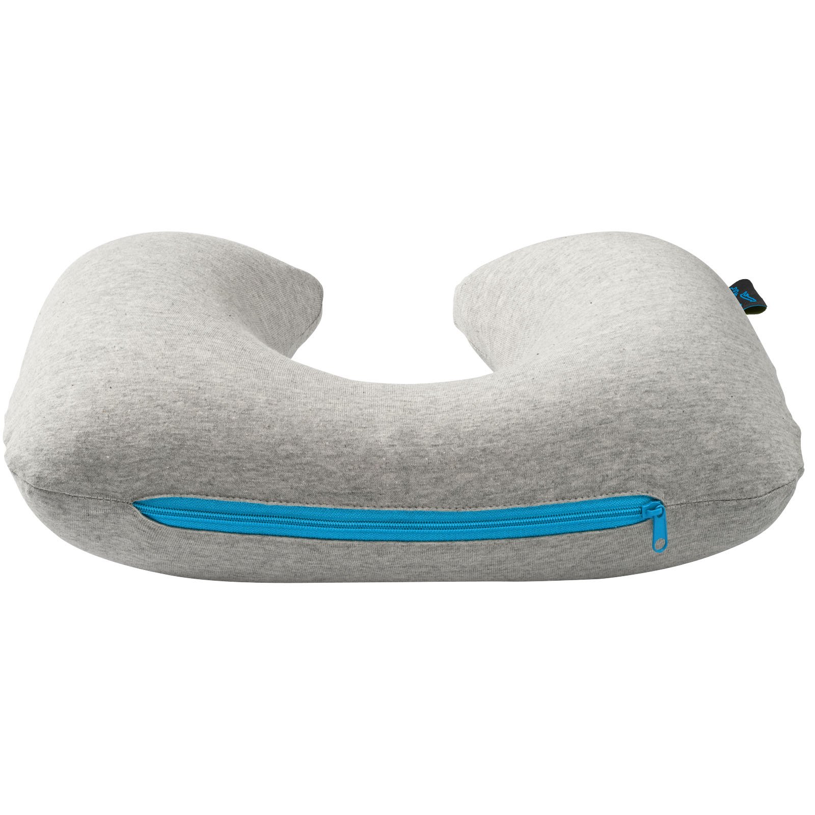 Ensemble de voyage souple contenant un oreiller gonflable avec zip bleu clair, bleu, un masque pour les yeux, des bouchons d’oreilles souples élastiques bleu clair et un étui souple avec cordon de serrage bleu vif.