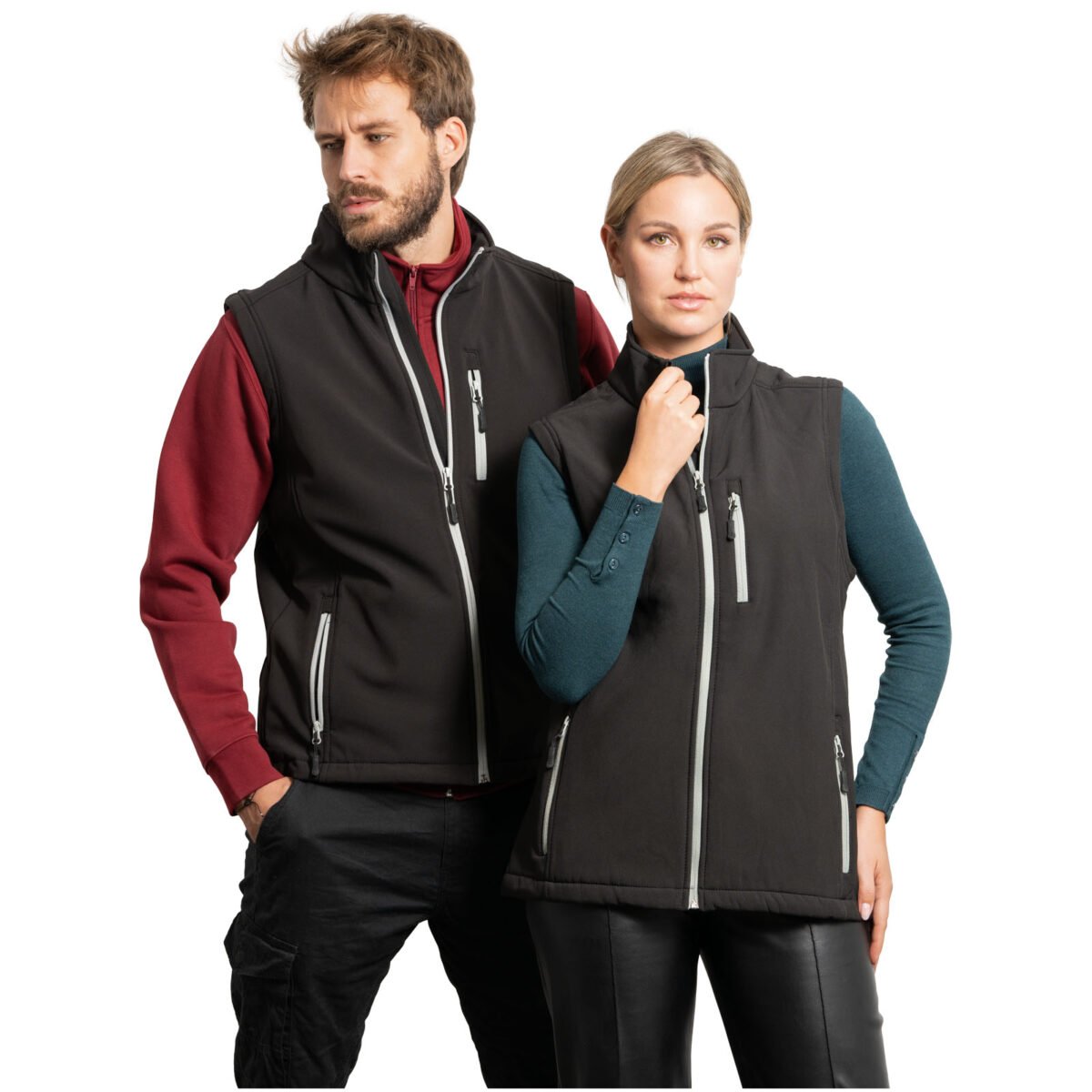 Gilet Softshell 2 couches. Fermeture zippée contrastée à effet scellé inversé avec protège-menton et tirette. Trois poches avec fermeture zippée combinée avec tirette. Cordon de serrage élastique et attaches sur l’ourlet inférieur. Résistant à l’eau. Modèle coupe-vent. Le mannequin mesure 184 cm et porte la taille L.