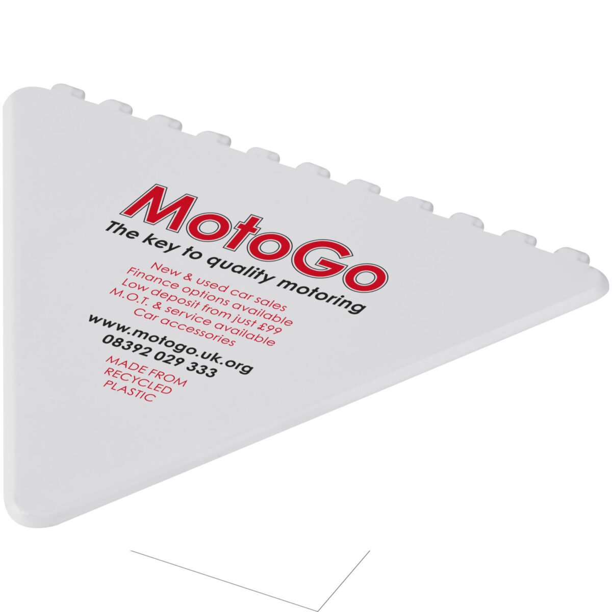 Grattoir triangulaire pour le pare-brise, avec une grande zone de marquage. Fabriqué au Royaume-Uni en plastique recyclé. Le grattoir à glace a une finition mouchetée due à la nature du matériau recyclé.