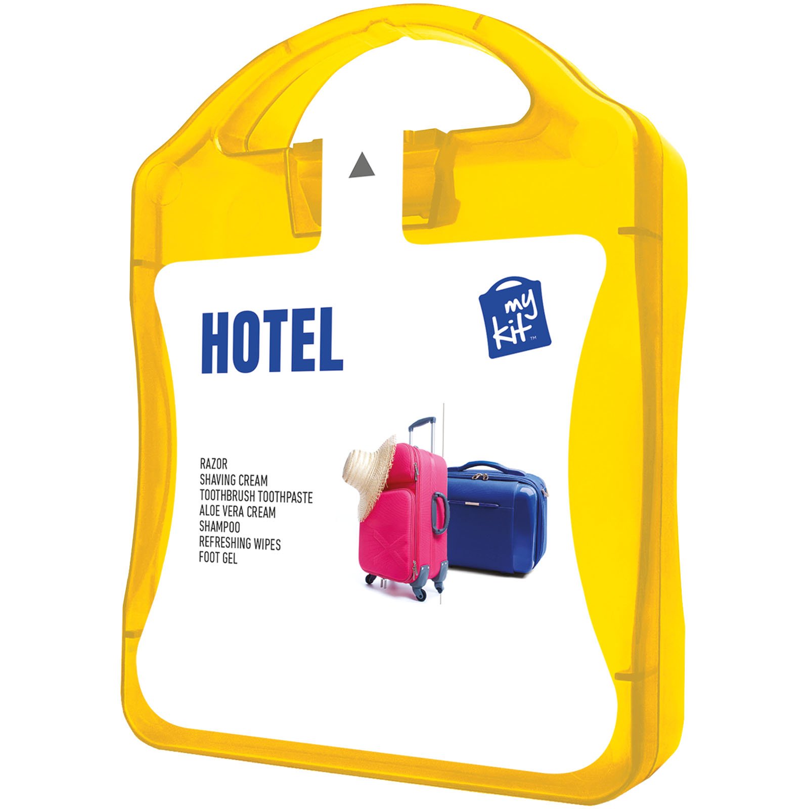 Le kit d’hôtel MyKit est idéal pour les voyages d’affaires ou les longues journées d’exposition. Contenu : 1 rasoir, 1 gel à raser, 1 crème à l’Aloe Vera, 1 shampooing, 1 gel pour les pieds, 1 lime à ongles, 1 brosse à dents et 1 dentifrice. Tous les produits de premiers secours et de soin du kit répondent à toutes les réglementations européennes applicables. Le prix comprend le marquage sur toute la surface.