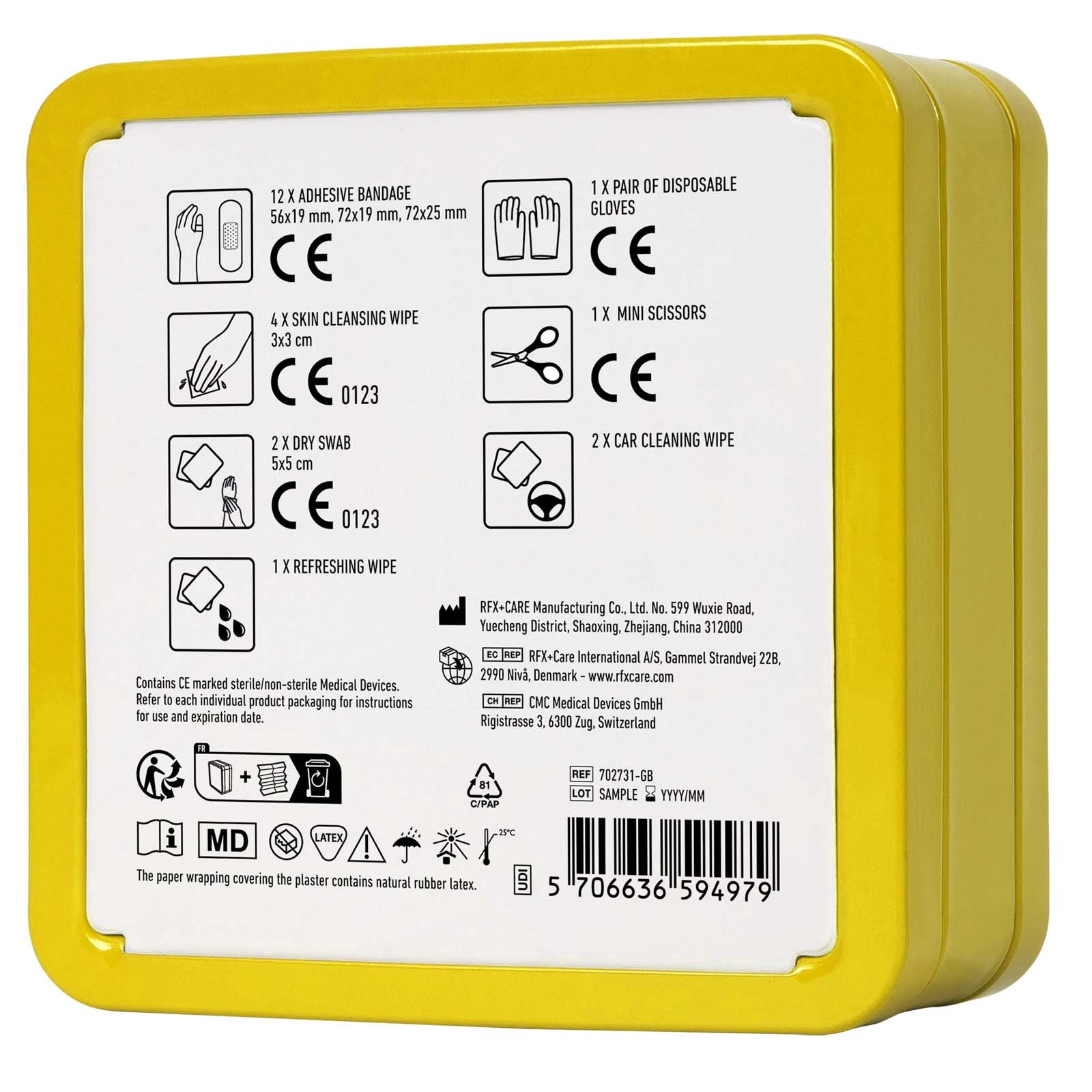 Cette trousse de premiers secours compacte est un indispensable de la voiture, pour être toujours prêt en cas d’accidents mineurs et de petites blessures sur la route. Elle contient 12 pansements résistants à l’eau, 2 tampons nettoyants pour la peau, 2 écouvillons secs, 1 paire de gants jetables, 2 paquets de lingettes nettoyantes pour voiture, 1 lingette rafraîchissante et 1 paire de mini-ciseaux. Tous les articles de premiers secours et de soins inclus sont conformes aux réglementations européennes en vigueur, pour une fiabilité sans faille durant vos trajets. Fourni dans une boîte réutilisable et recyclable.