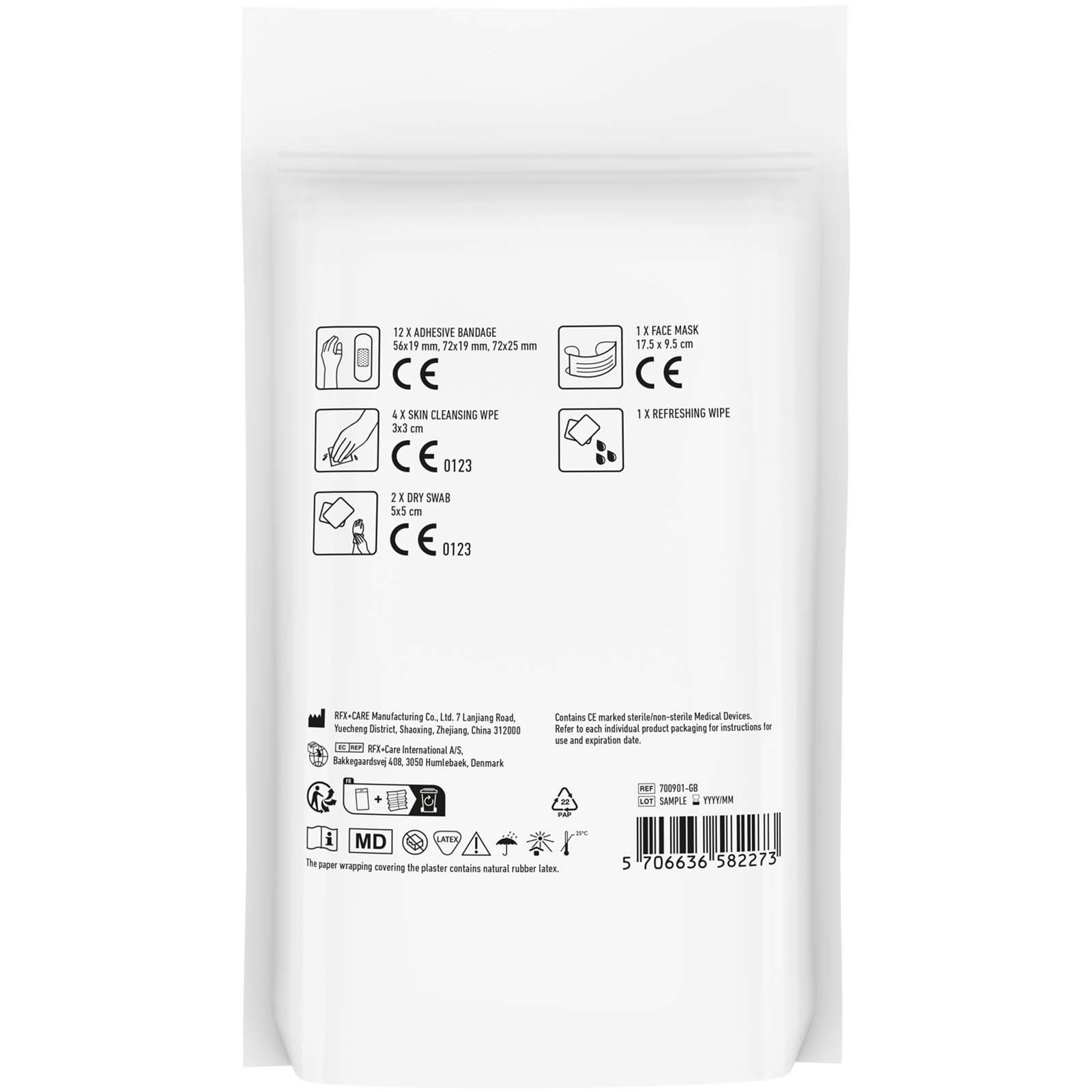 Ce kit devrait être sur tous les lieux de travail pour être prêt en cas de petites blessures ou d’urgences. Contenu : 12 pansements résistants au lavage, 2 tampons secs, 1 masque facial, 1 lingette rafraîchissante et 4 tampons nettoyants pour la peau. Tous les produits de premiers secours et de soin du kit répondent à toutes les réglementations européennes applicables. Le prix comprend le marquage sur toute la surface. Livrés dans une pochette en papier.