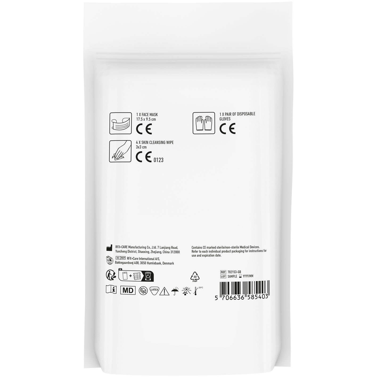 Kit de protection pratique, à conserver à la maison, dans la voiture ou pour emporter en vacances. Contenu du kit : 1 masque facial, 4 lingettes nettoyantes pour les mains et 1 paire de gants. Tous les éléments du kit répondent à toutes les réglementations européennes applicables. Le prix comprend le marquage sur toute la surface. Livré en pochette papier.