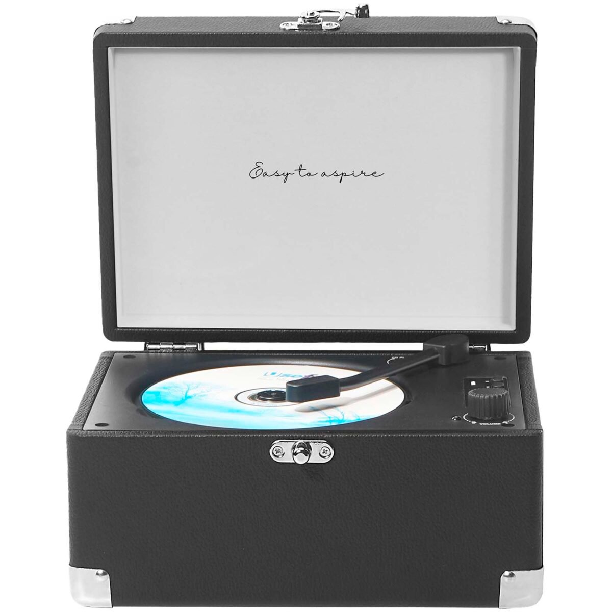 Lecteur de CD et de musique avec connexion USB, AUX et sans fil, ainsi qu’une sortie pour casque. Il est portable et offre une autonomie de 8 heures. Grâce à son design en forme de tourne-disque, ce lecteur CD confère une touche vintage à votre intérieur.