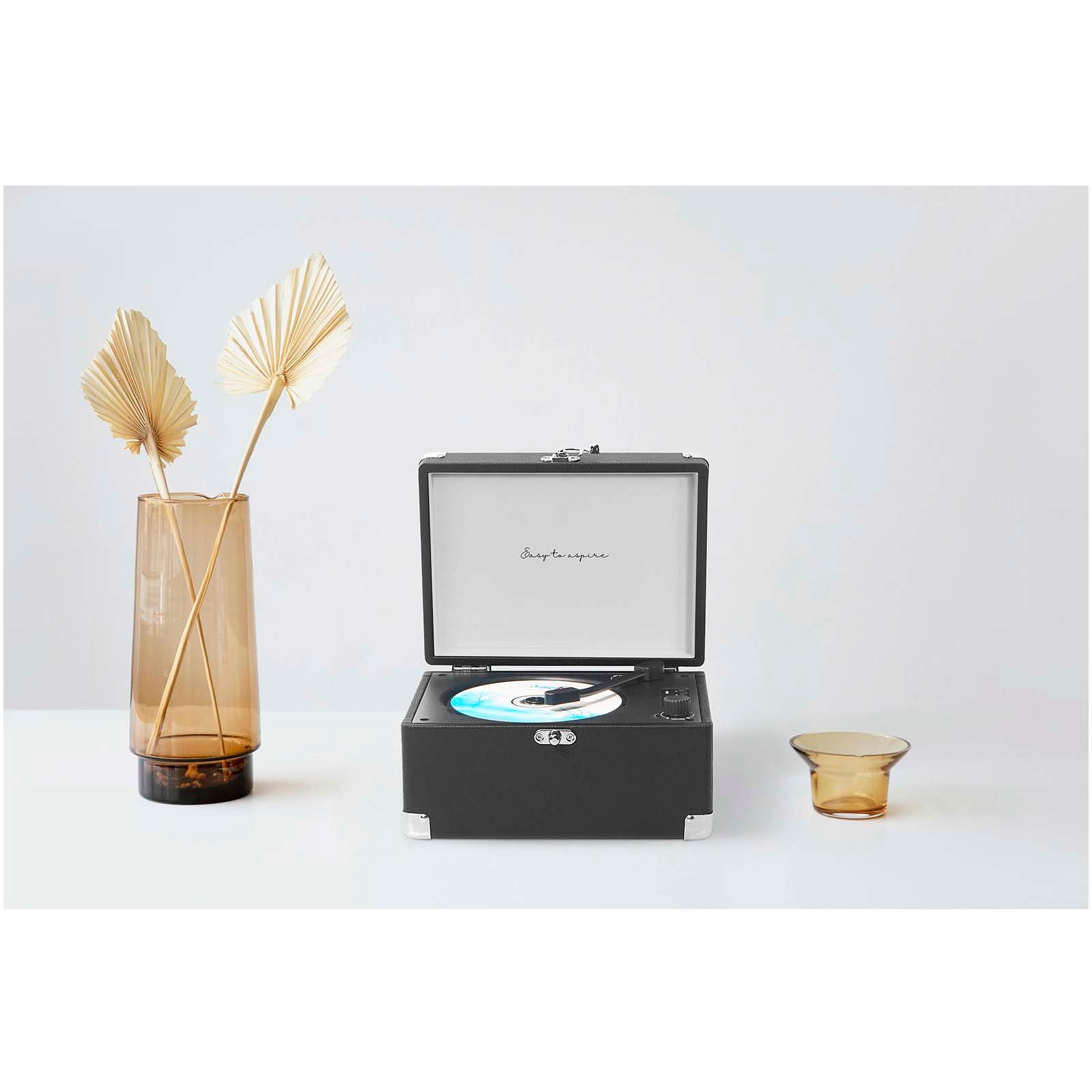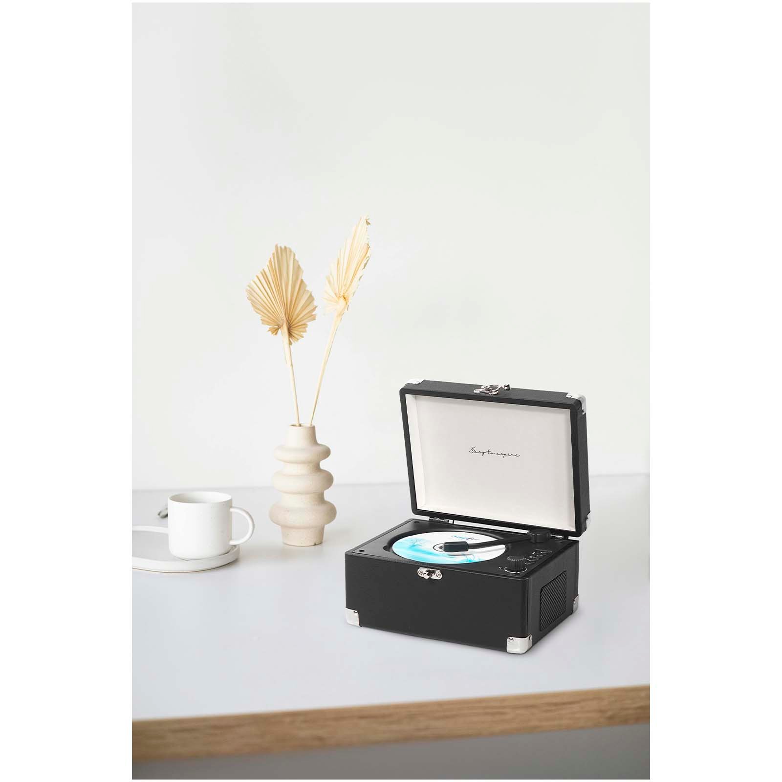 Lecteur de CD et de musique avec connexion USB, AUX et sans fil, ainsi qu’une sortie pour casque. Il est portable et offre une autonomie de 8 heures. Grâce à son design en forme de tourne-disque, ce lecteur CD confère une touche vintage à votre intérieur.