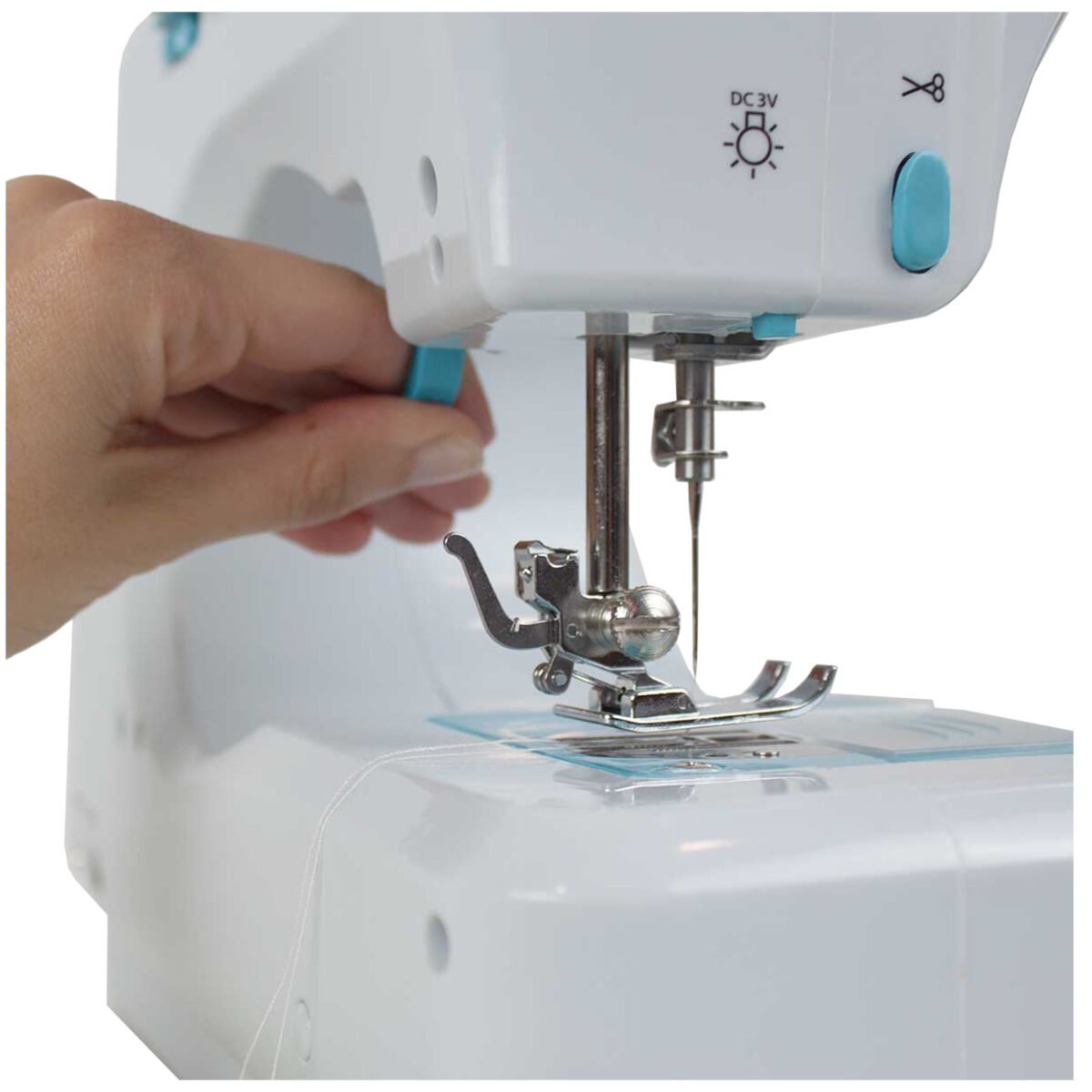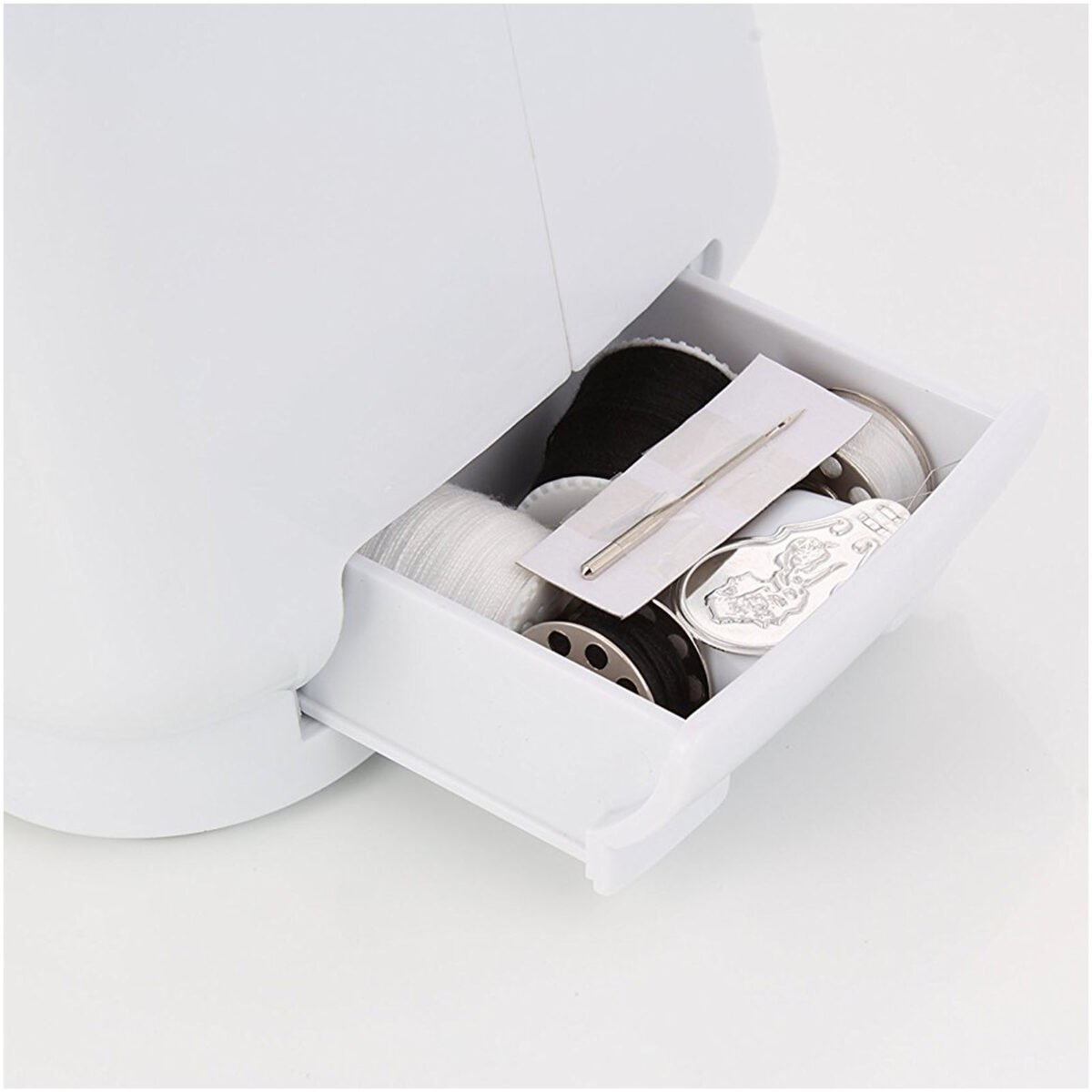 Machine à coudre avec 12 motifs de points intégrés. Tiroir intégré pour ranger les fils, aiguilles et autres outils. Légère pour améliorer la visibilité en cousant. Comprend une pédale et un adaptateur. Couture en marche avant et arrière. La machine est mise en marche par l’interrupteur manuel ou par la pédale. Elle peut être branchée sur une prise murale ou utilisée avec des batteries (4 x AA). Régulateur de tension. Cadran de sélection. Coupe-fil. Volant à bobine.