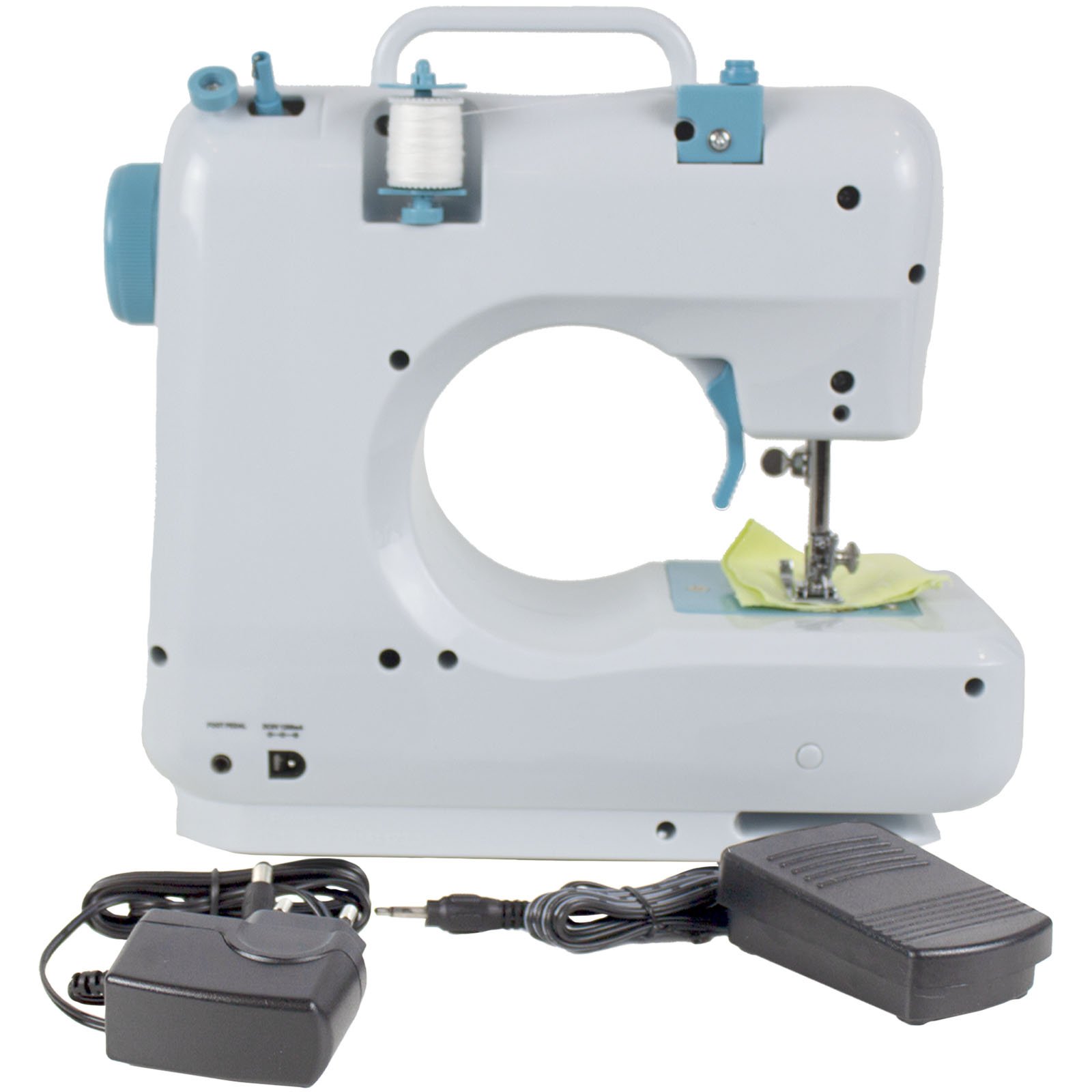 Machine à coudre avec 12 motifs de points intégrés. Tiroir intégré pour ranger les fils, aiguilles et autres outils. Légère pour améliorer la visibilité en cousant. Comprend une pédale et un adaptateur. Couture en marche avant et arrière. La machine est mise en marche par l’interrupteur manuel ou par la pédale. Elle peut être branchée sur une prise murale ou utilisée avec des batteries (4 x AA). Régulateur de tension. Cadran de sélection. Coupe-fil. Volant à bobine.