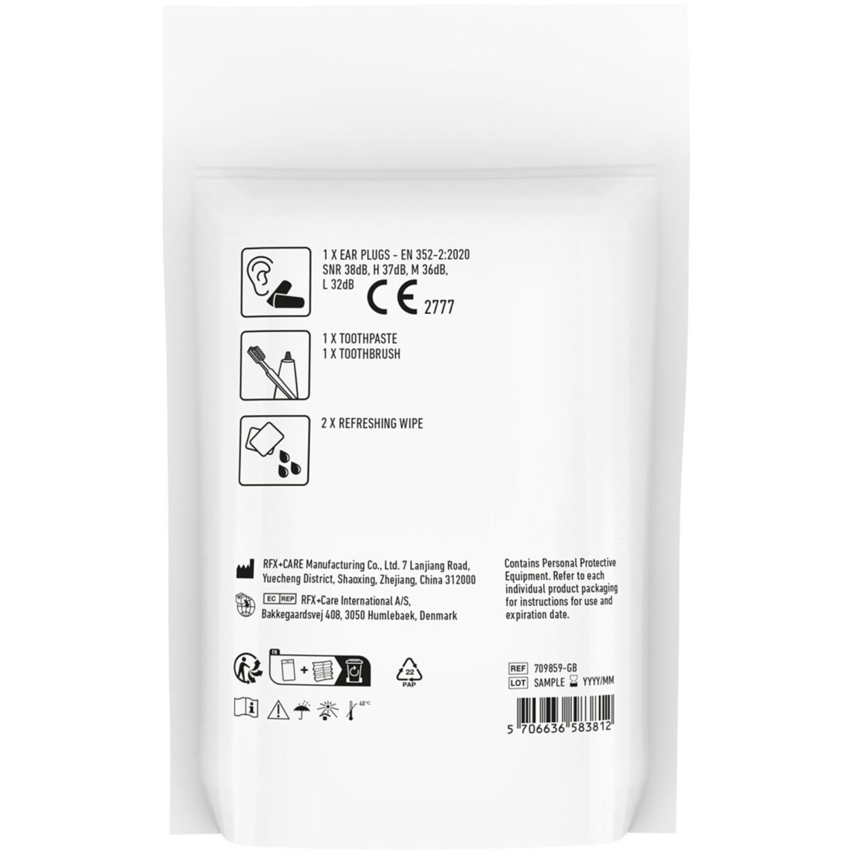 Le kit pour se rafraichir à bord. Contient:1 brosse à dents, 1 tube de dentifrice, 2 bouchons anti bruit, 2 lingettes rafraichissantes. Tous les contenus à l’intérieur des kits sont conformes à la législation européenne. Le prix comprend l’étiquette personnalisée. Livré en pochette papier.