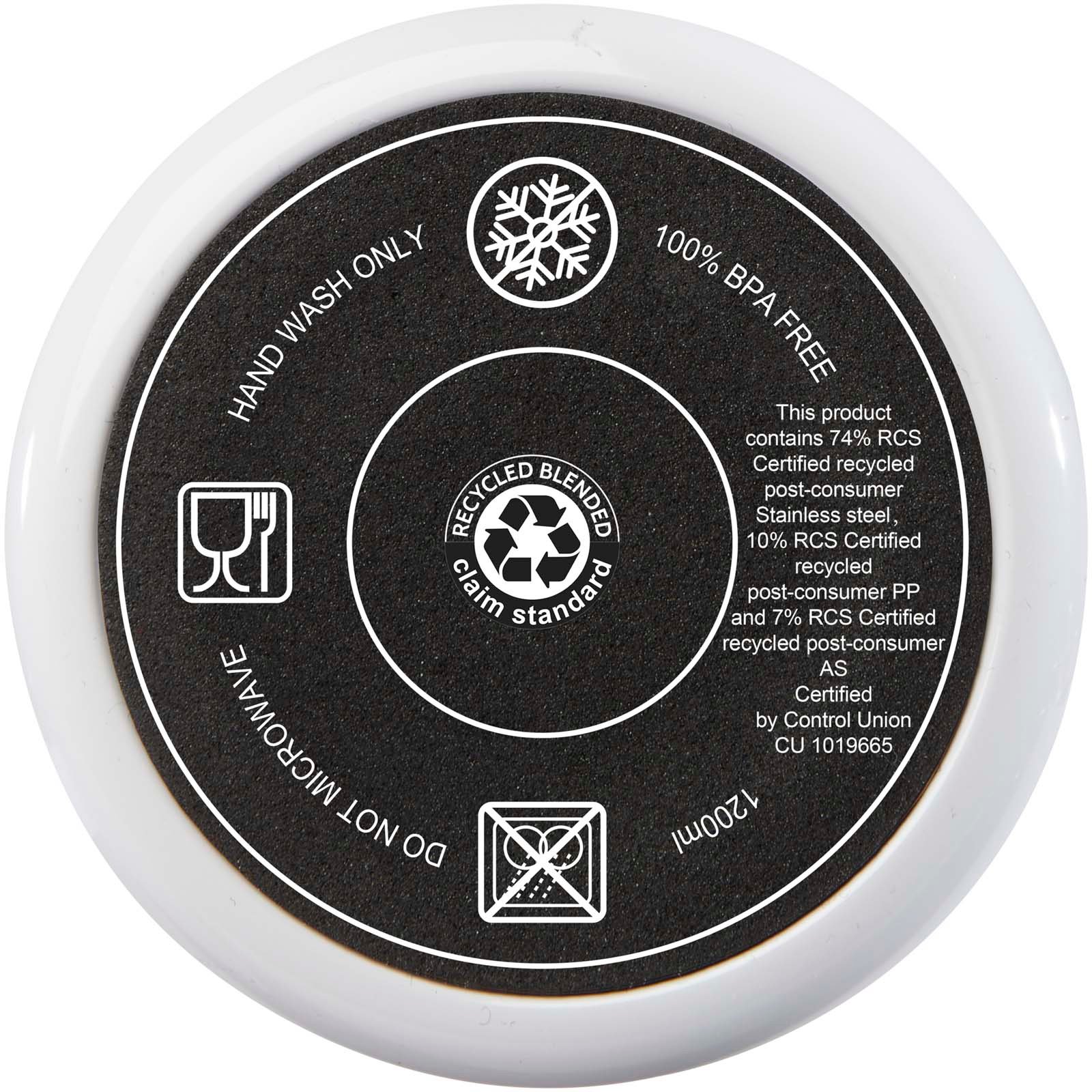 Le mug Melbourne est doté d’une double paroi isolante, qui permet de garder les boissons chaudes pendant 2 heures ou froides pendant 4 heures. La paroi intérieure du mug est composée de plastique recyclé, et la paroi extérieure est en acier inoxydable recyclé certifié RCS. Le mug a une capacité de 1 200 ml, ce qui vous permettra de rester hydraté avec style tout au long de la journée. Comprend un couvercle à pression anti-éclaboussures avec deux ouvertures et une fermeture pivotante. Livré avec une paille recyclée de qualité alimentaire. Lavage à la main uniquement.