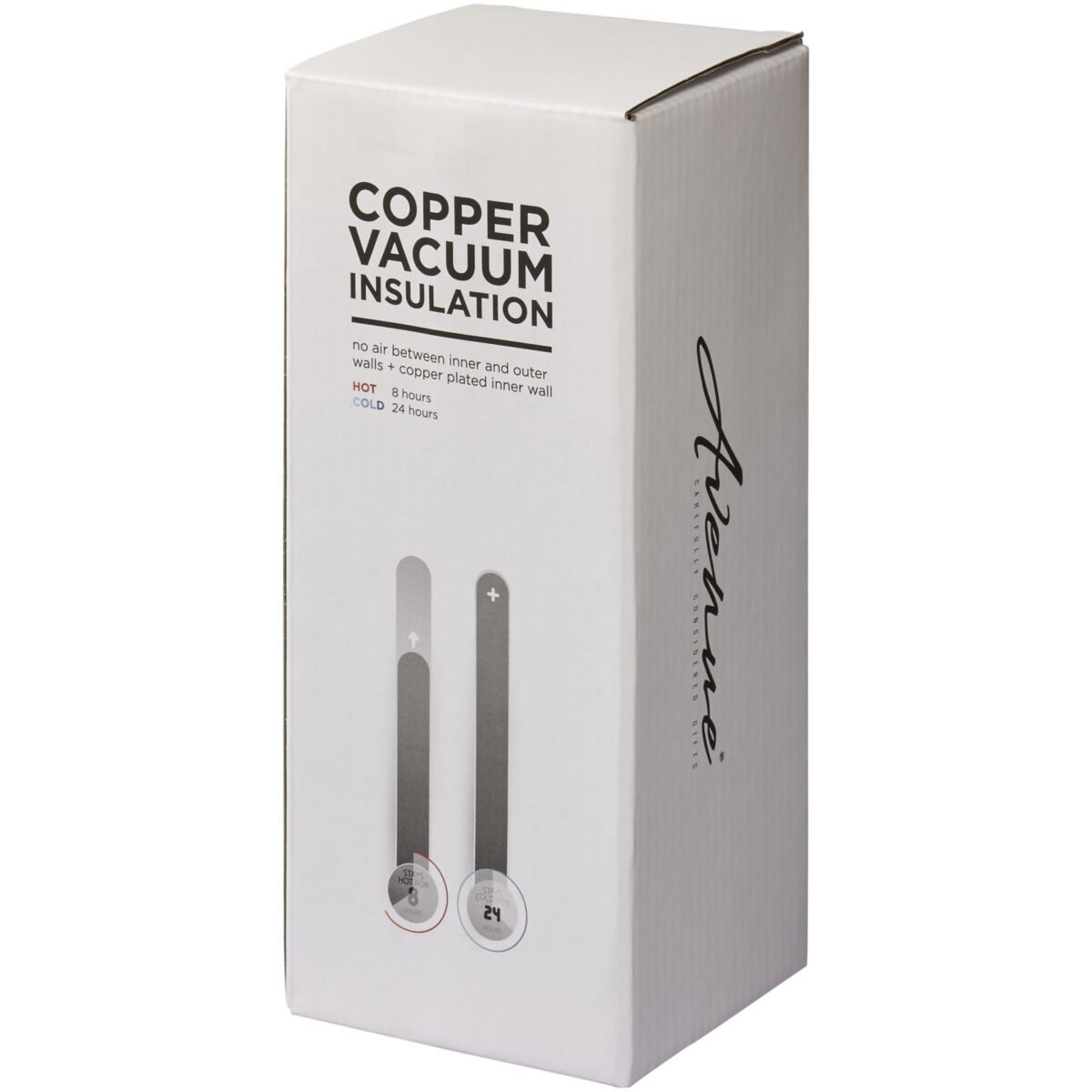Ce mug durable est idéal pour les déplacements. Le couvercle est étanche. Le mug présente une construction à double paroi en acier inoxydable avec isolation par le vide en cuivre, ce qui signifie qu’il tiendra les boissons chaudes pendant 8 heures et froides pendant 24 heures. La construction empêche également la condensation à l’extérieur du mug. La capacité est de 500 ml. Présenté dans une boîte cadeau Avenue.