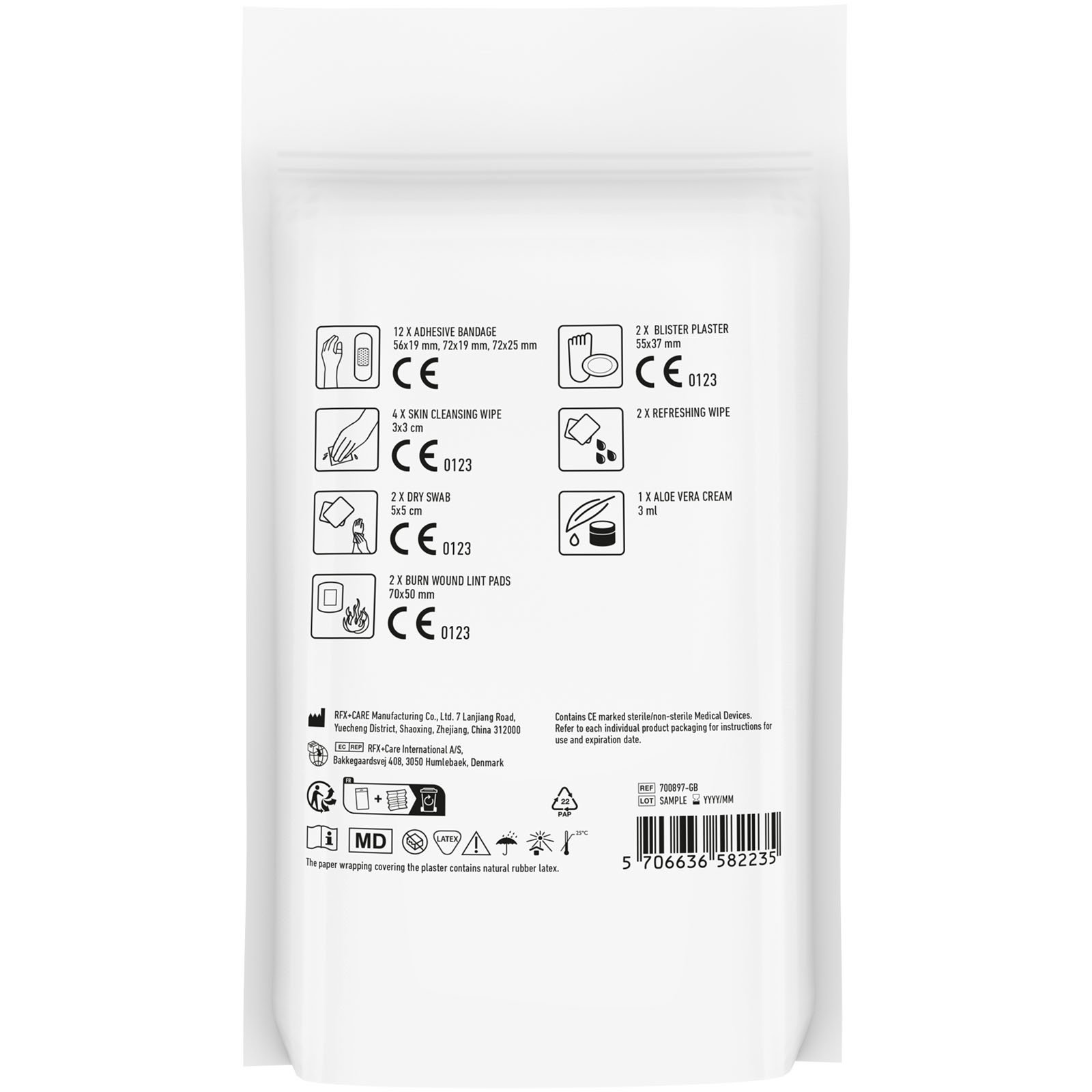 Le kit idéal pour les voyageurs. Contient: 12 pansements, 4 cotons pour nettoyer la peau, 2 cotons secs, 2 compresses pour les brulures, 1 pansement, 2 lingettes rafraichissantes, 1 crème aloe vera.Tous les contenus à l’intérieur des kits sont conformes à la législation européenne. Le prix comprend l’étiquette personnalisée. Livré en pochette papier.