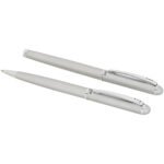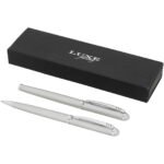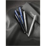 Parure stylo à bille avec mécanisme twist au design exclusif et roller. Disponible en noir brillant, argenté mat et bleu mat. Emballé dans une boîte cadeau « LUXE » (17 x 5,5 x 3 cm).