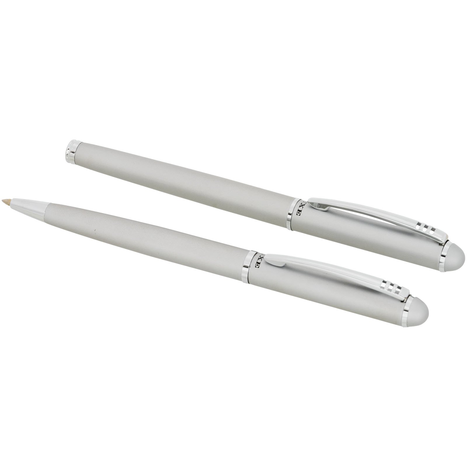 Parure stylo à bille avec mécanisme twist au design exclusif et roller. Disponible en noir brillant, argenté mat et bleu mat. Emballé dans une boîte cadeau « LUXE » (17 x 5,5 x 3 cm).