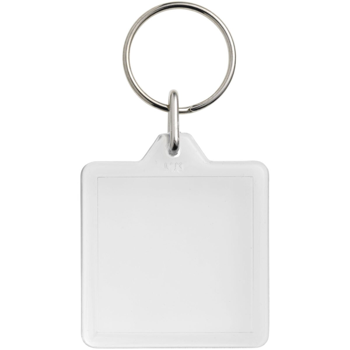 Porte-clés transparent U1 carré avec anneau fendu en métal. L’anneau en forme de boucle métallique présente un profil plat idéal pour les envois. Dimensions de l’insert pour impression : 3,2 cm x 3,2 cm.