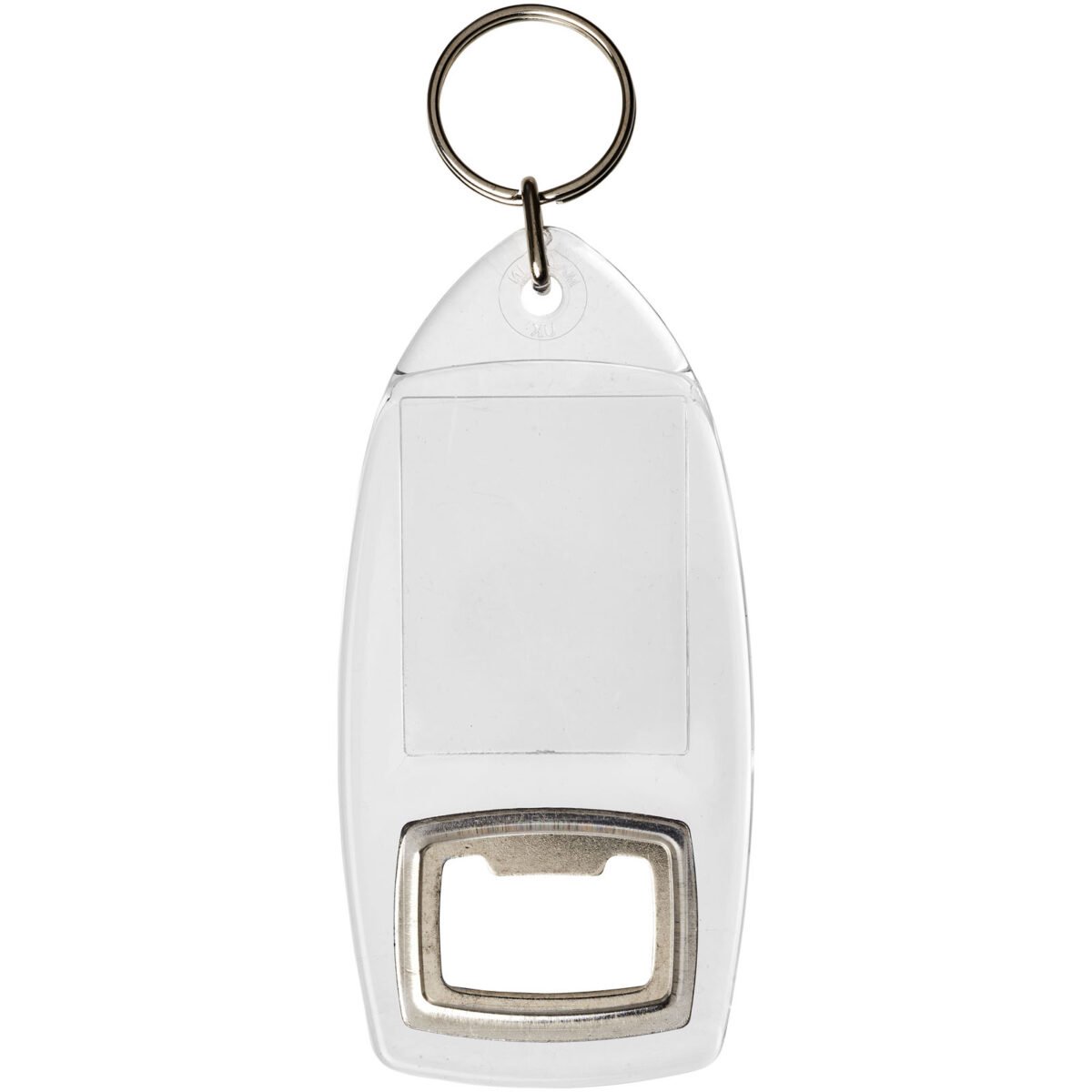 Porte-clés transparent R1 avec décapsuleur et anneau fendu en métal. L’anneau en forme de boucle métallique présente un profil plat idéal pour les envois. Dimensions de l’insert pour impression : 4,0 cm x 3,2 cm.