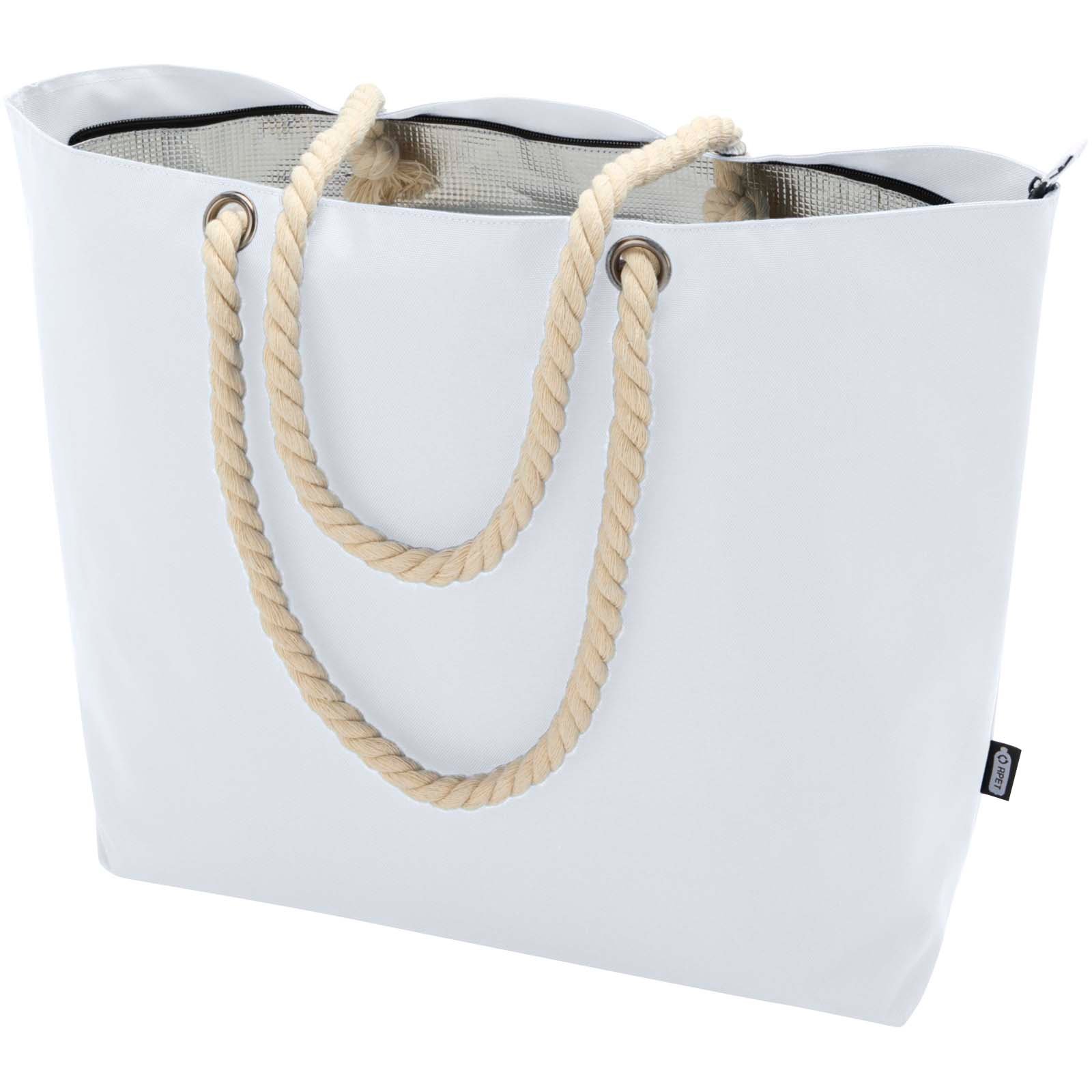 Le sac shopping isotherme Panama est fabriqué en polyester recyclé certifié GRS et comporte un grand compartiment principal zippé, ainsi que des poignées en aluminium et en corde de coton de haute qualité. Convient pour diverses activités telles que les courses ou pour une journée à la plage ou au parc. Capacité : 23 litres. Capacité de charge maximale de 10 kg. Sans PVC.