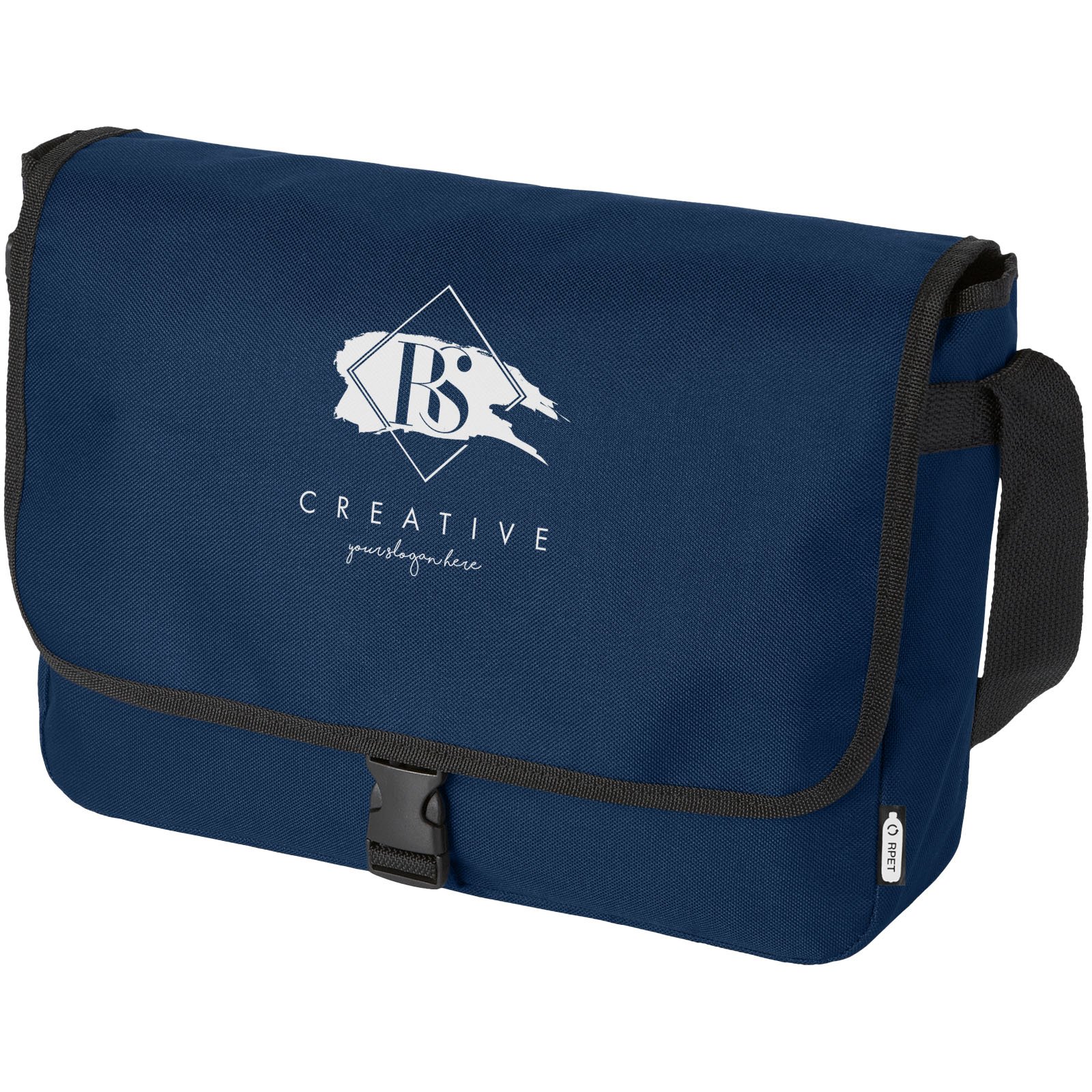 Sac à bandoulière en plastique recyclé PET avec une bandoulière réglable. Comprend un compartiment principal qui se ferme avec un rabat et une fermeture à boucle.