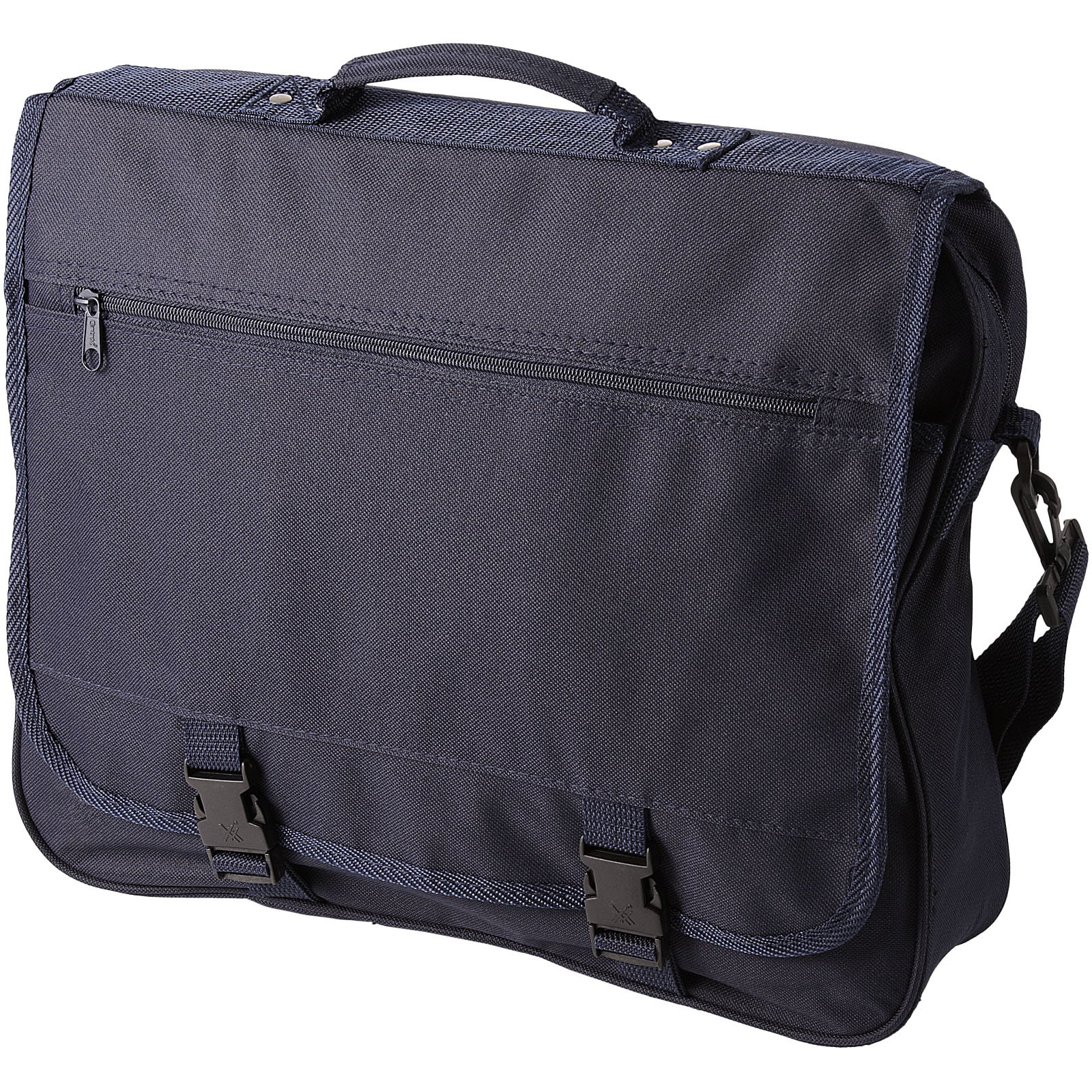 Serviette avec bandoulière ajustable, rabat à fermeture par boucle, poche zippée dans le rabat, compartiment principal zippé et plusieurs poches ouvertes sous le rabat.