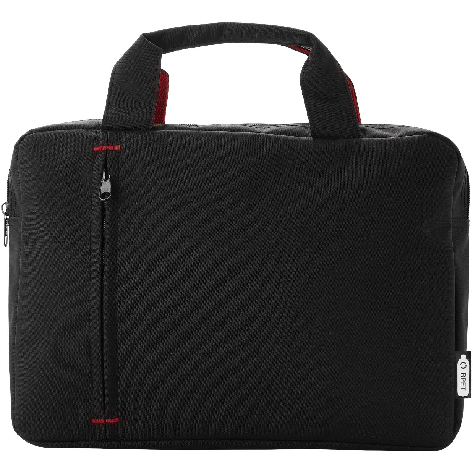 Serviette en plastique recyclé PET dotée d’un compartiment principal à fermeture zippée et d’une poche frontale à fermeture zippée, avec poignées de transport renforcées et éléments de contraste de couleur tendance.