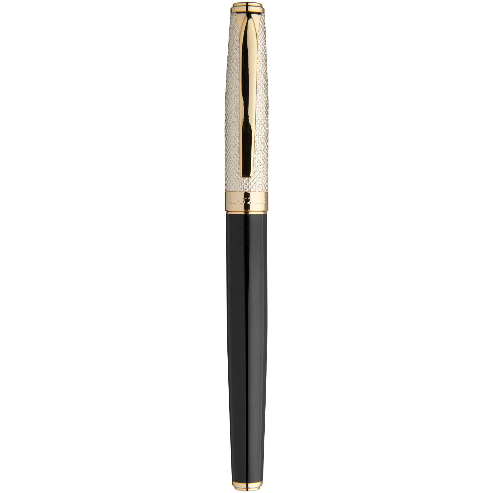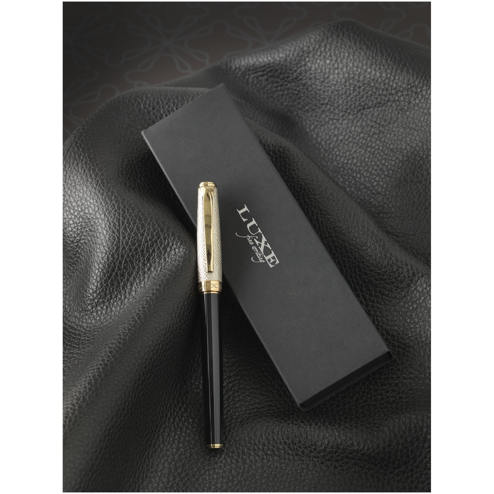 Un stylo roller luxueux, avec capuchon en cuir doré et pièces dorées laquées, livré dans une boîte cadeau Luxe. La partie inférieure du corps est en laiton laqué et la partie supérieure en laiton et PU. Stylo roller : 14 cm x 1,15 cm, poids : 32 g, longueur d’écriture : 500 m.