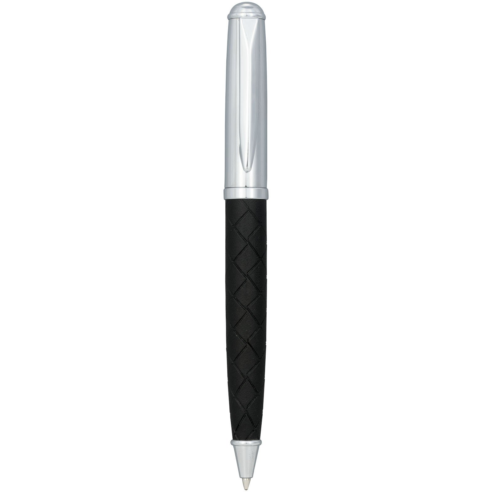 Stylo à bille au design exclusif avec corps inférieur recouvert de motif en croix en cuir. Recharge de qualité supérieure d’encre noire incluse dans une boîte cadeau « LUXE » (16 x 4,5 x 2,5 cm).