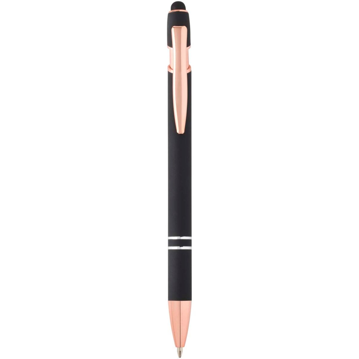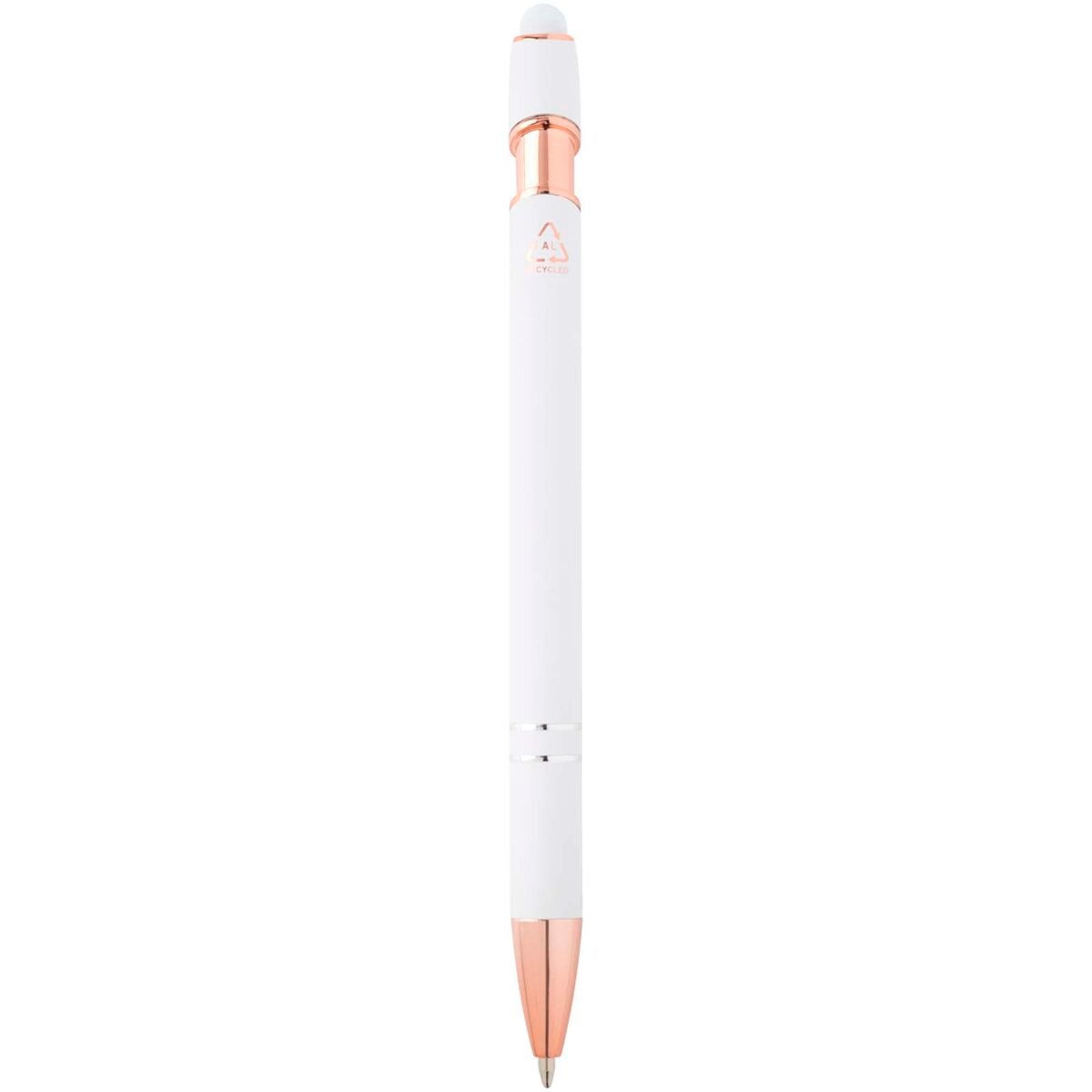 Le stylo bille Nanna avec finition or rose est pourvu d’un corps en aluminium recyclé et d’un stylet tactile en silicone. L’aluminium recyclé réduit également la quantité de déchets dans les décharges et contribue ainsi à la conservation des ressources naturelles, tout en réduisant les émissions de gaz à effet de serre. Couleur de l’encre : Bleue. Longueur d’écriture : 800 mètres. Taille de la plume : 1,0 mm.