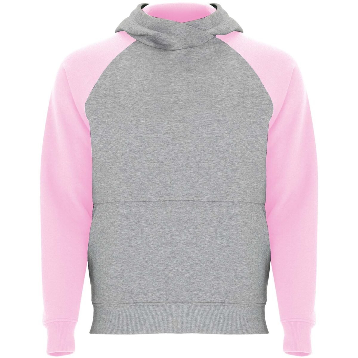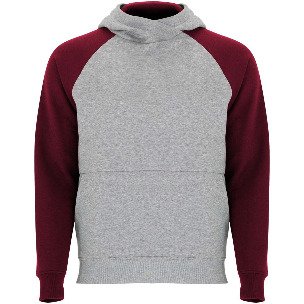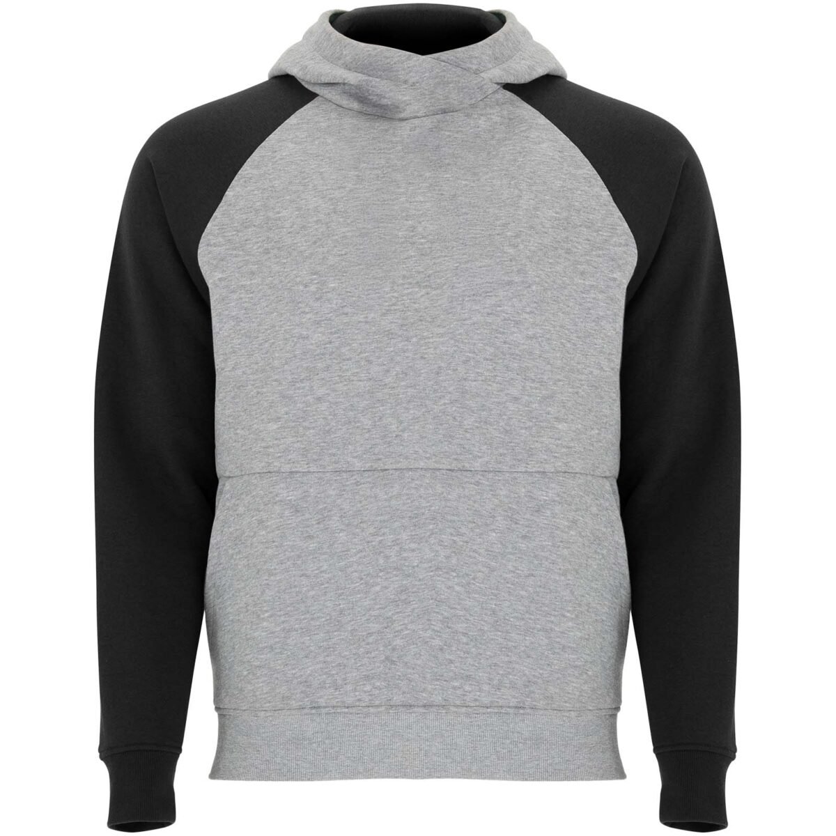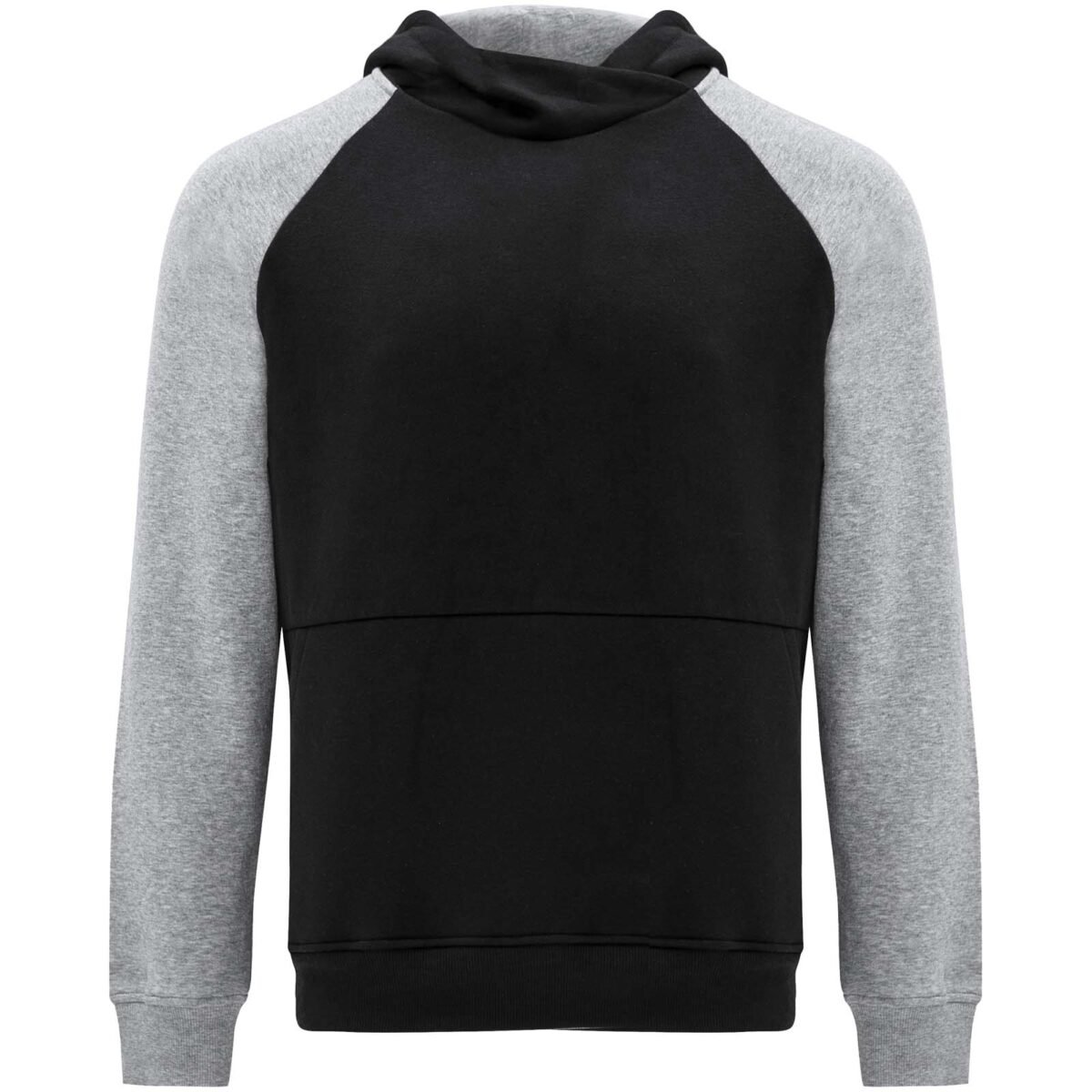 Sweat à capuche unisexe bicolore. Capuche avec col croisé et œillets métalliques. Capuche intérieure contrastée, cordon de serrage et manches raglan. Poche kangourou. Poignets et bas en côte avec élasthanne 1×1. Étiquette détachable.