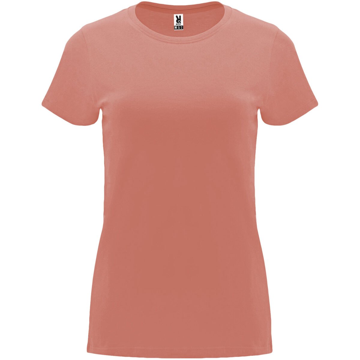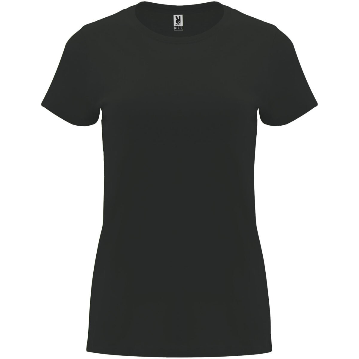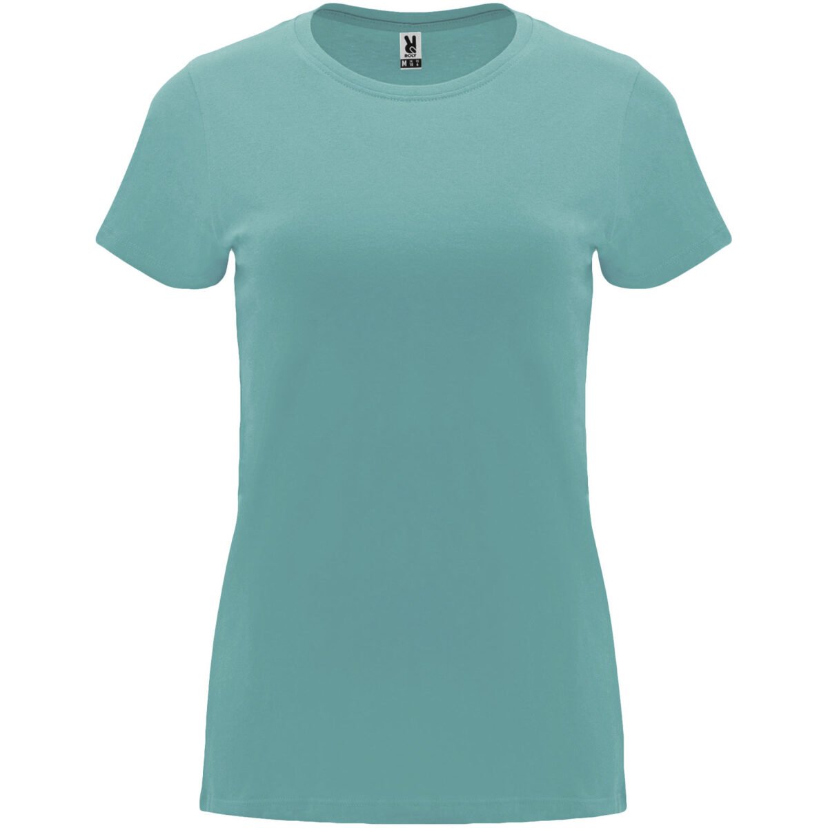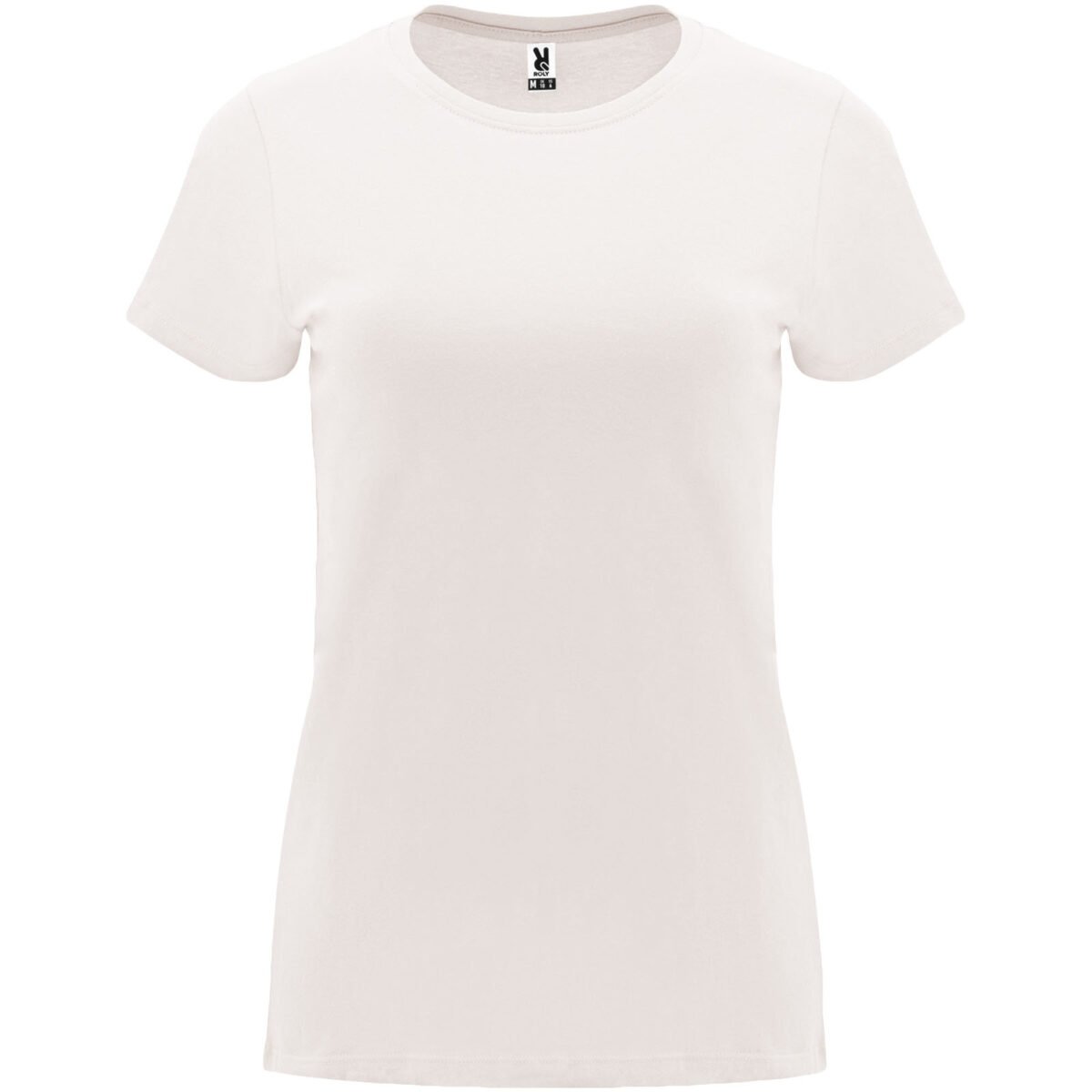 T-shirt ajusté à manches courtes pour femme. Col rond côtelé 1×1. Coutures recouvertes renforcées au col. Étiquette détachable.