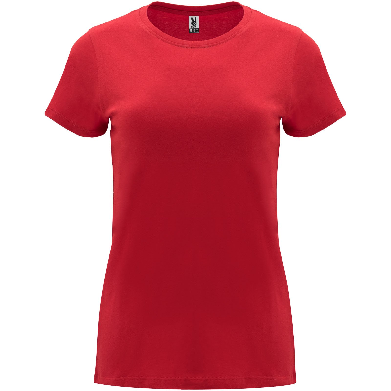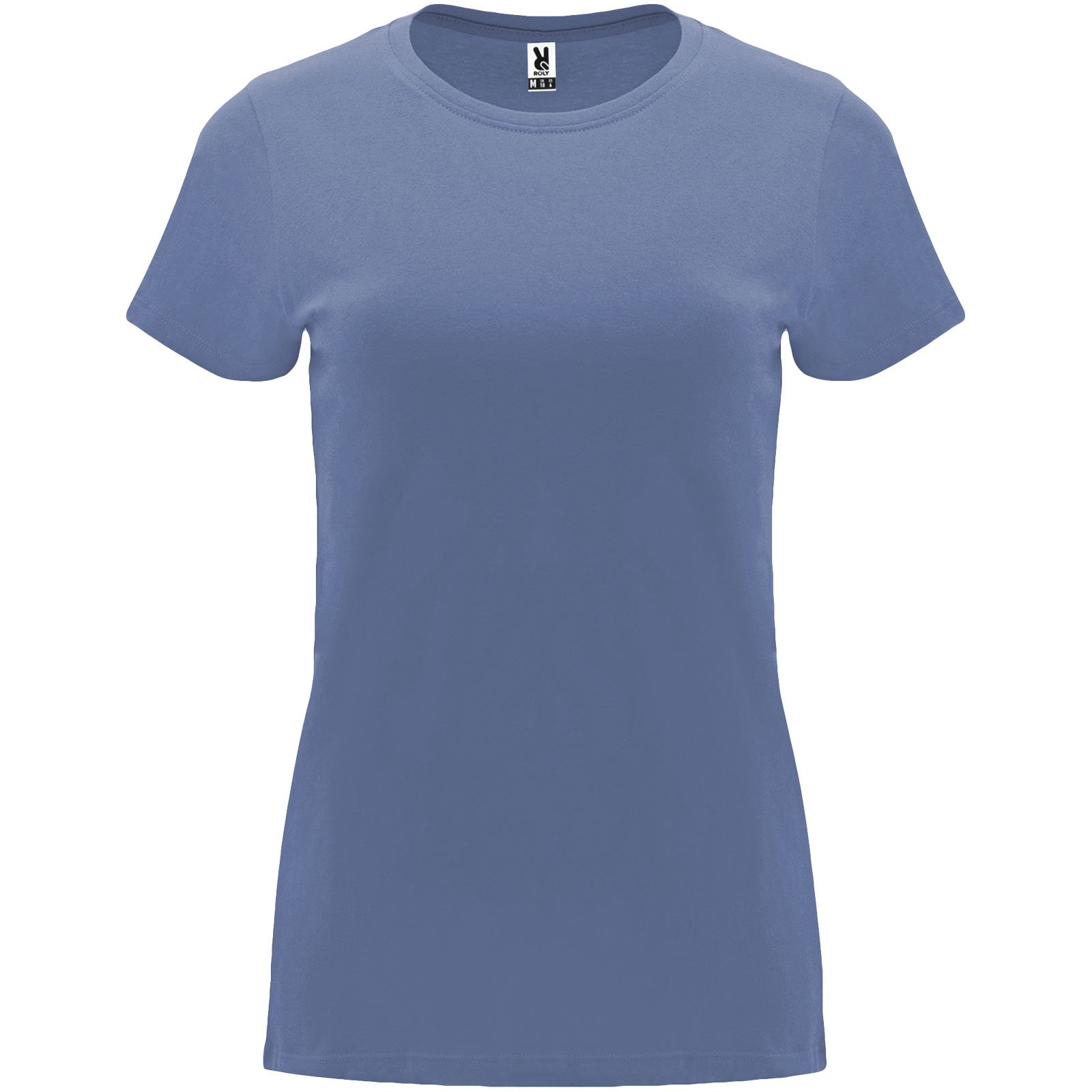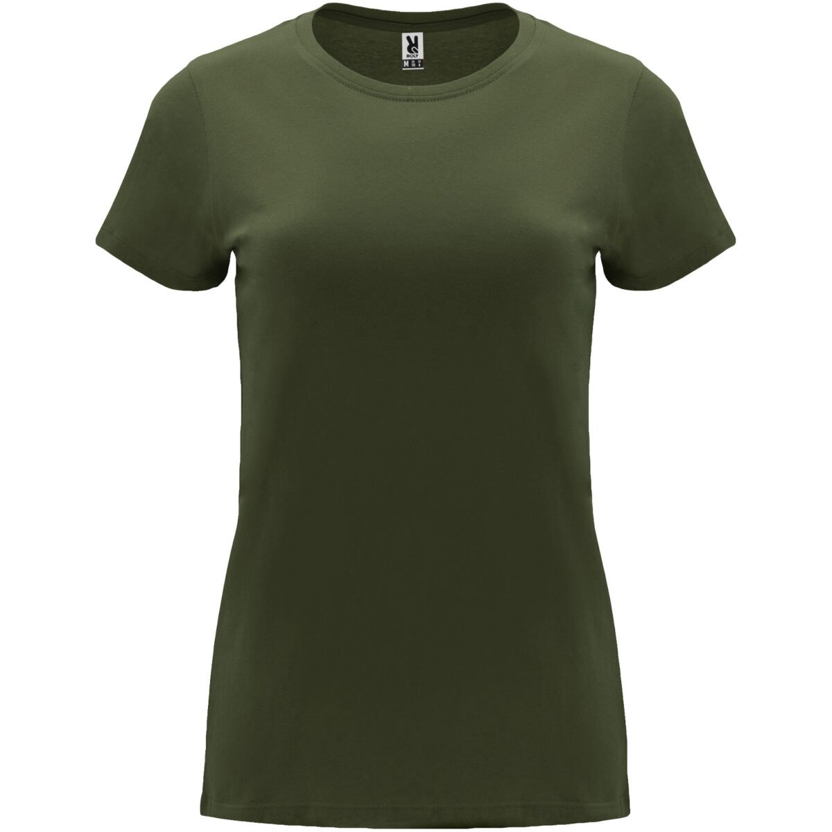 T-shirt ajusté à manches courtes pour femme. Col rond côtelé 1×1. Coutures recouvertes renforcées au col. Étiquette détachable.