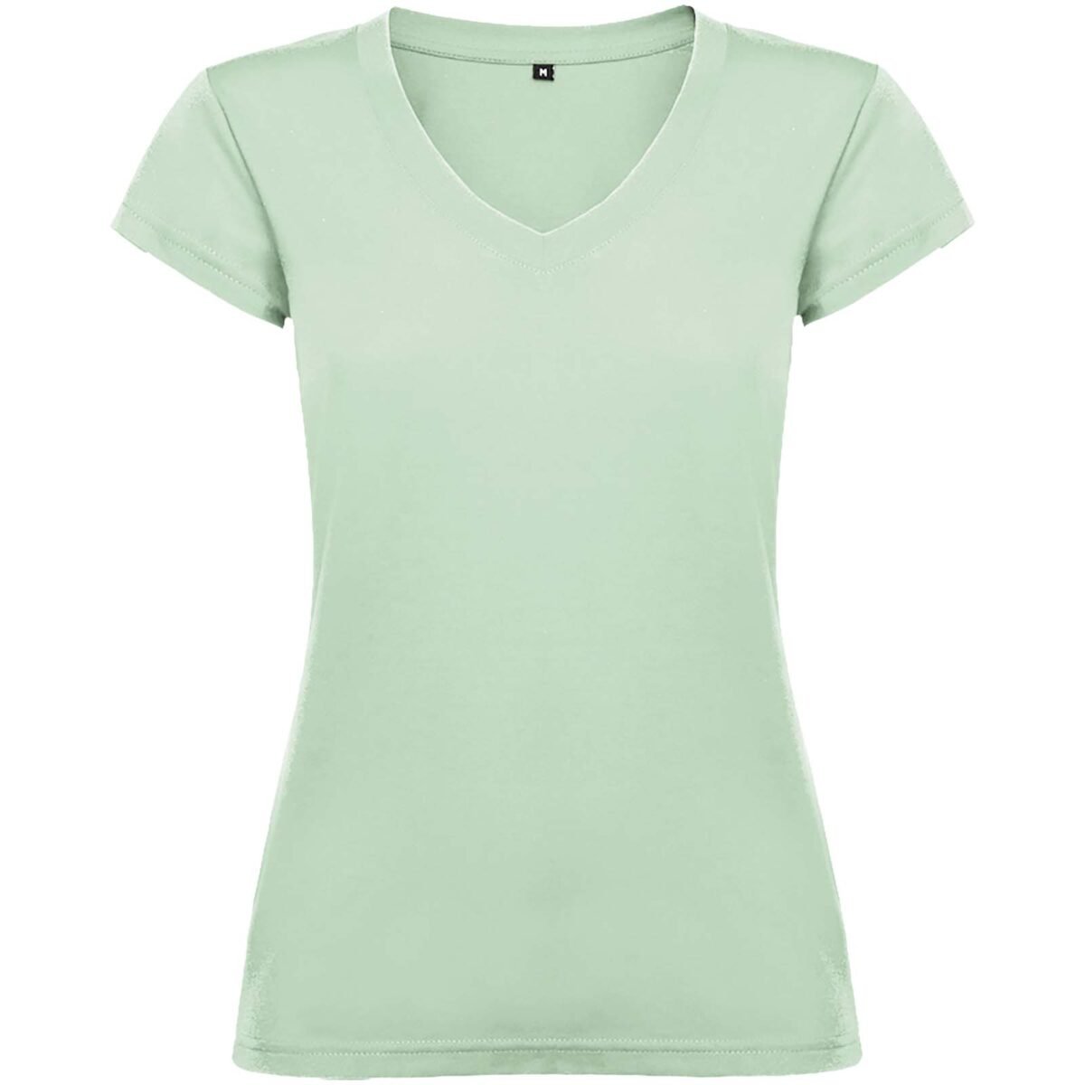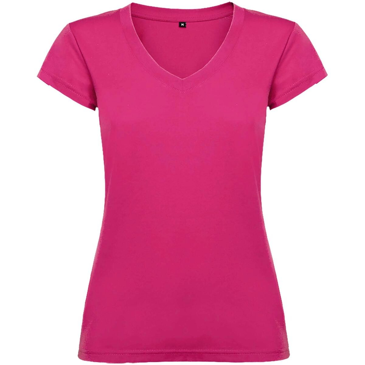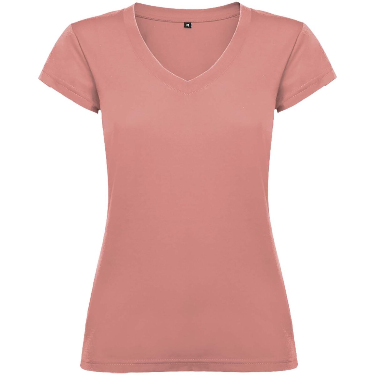 T-shirt col V à manches courtes pour femme avec finitions en côte 1×1. Coupe slim avec coutures latérales. Étiquette détachable. Le mannequin mesure 174 cm et porte la taille S.