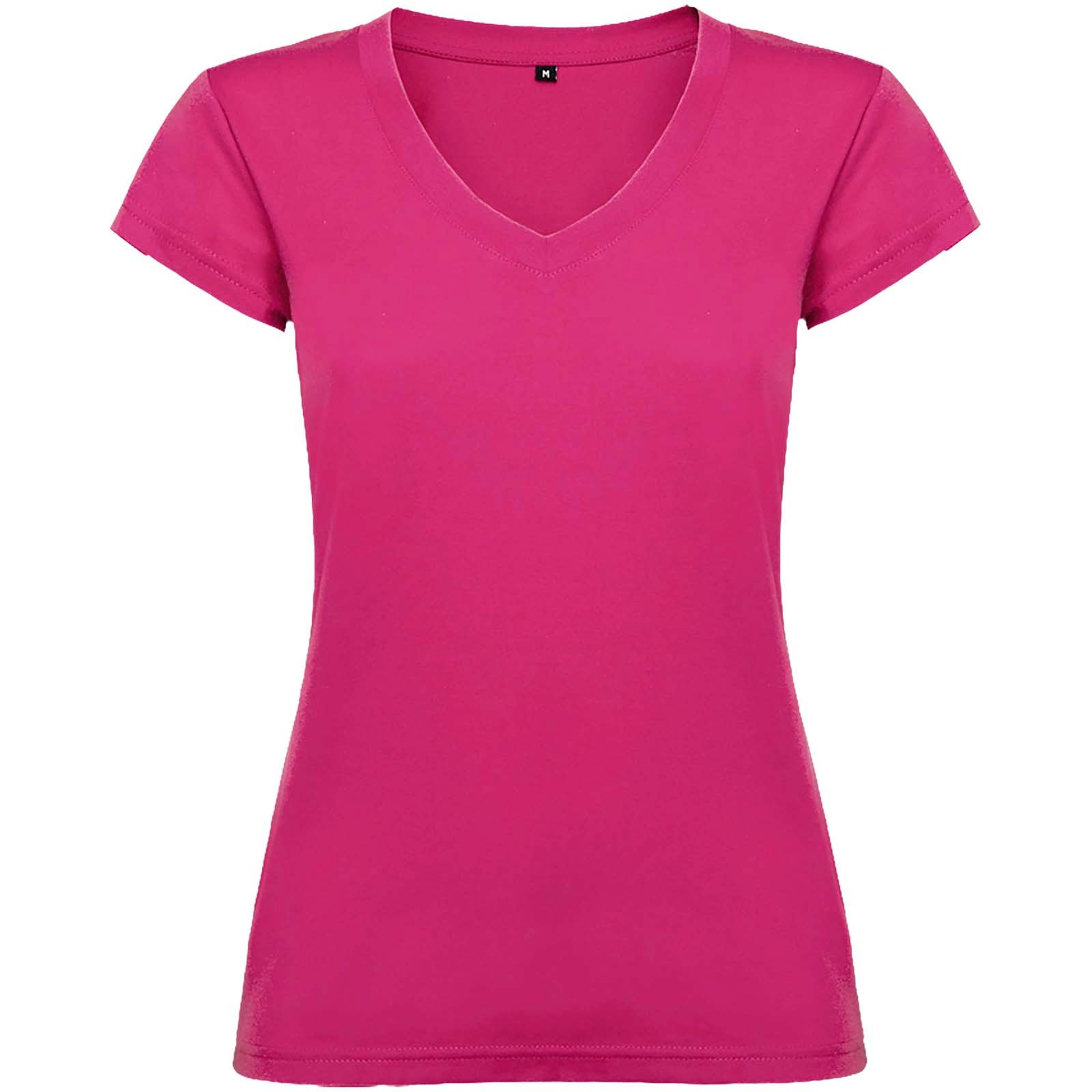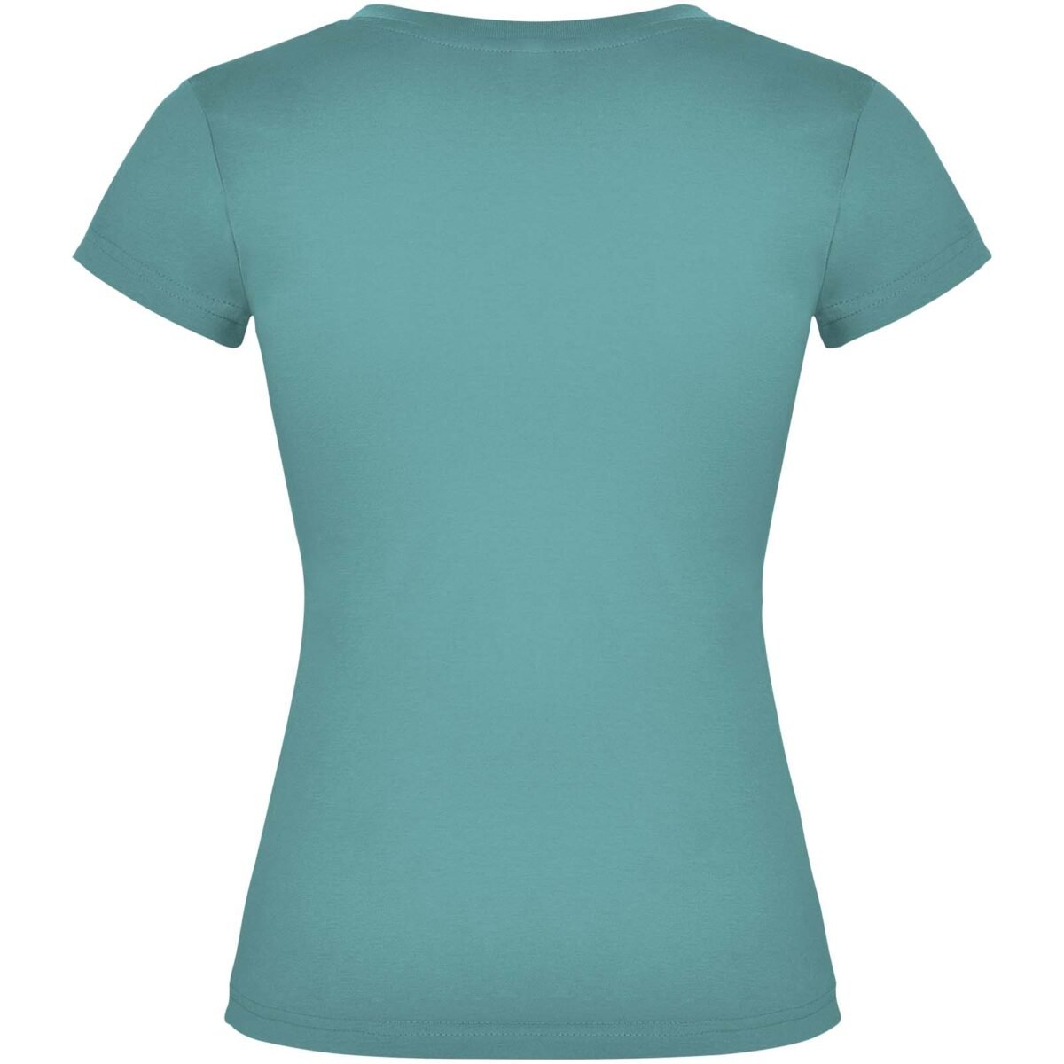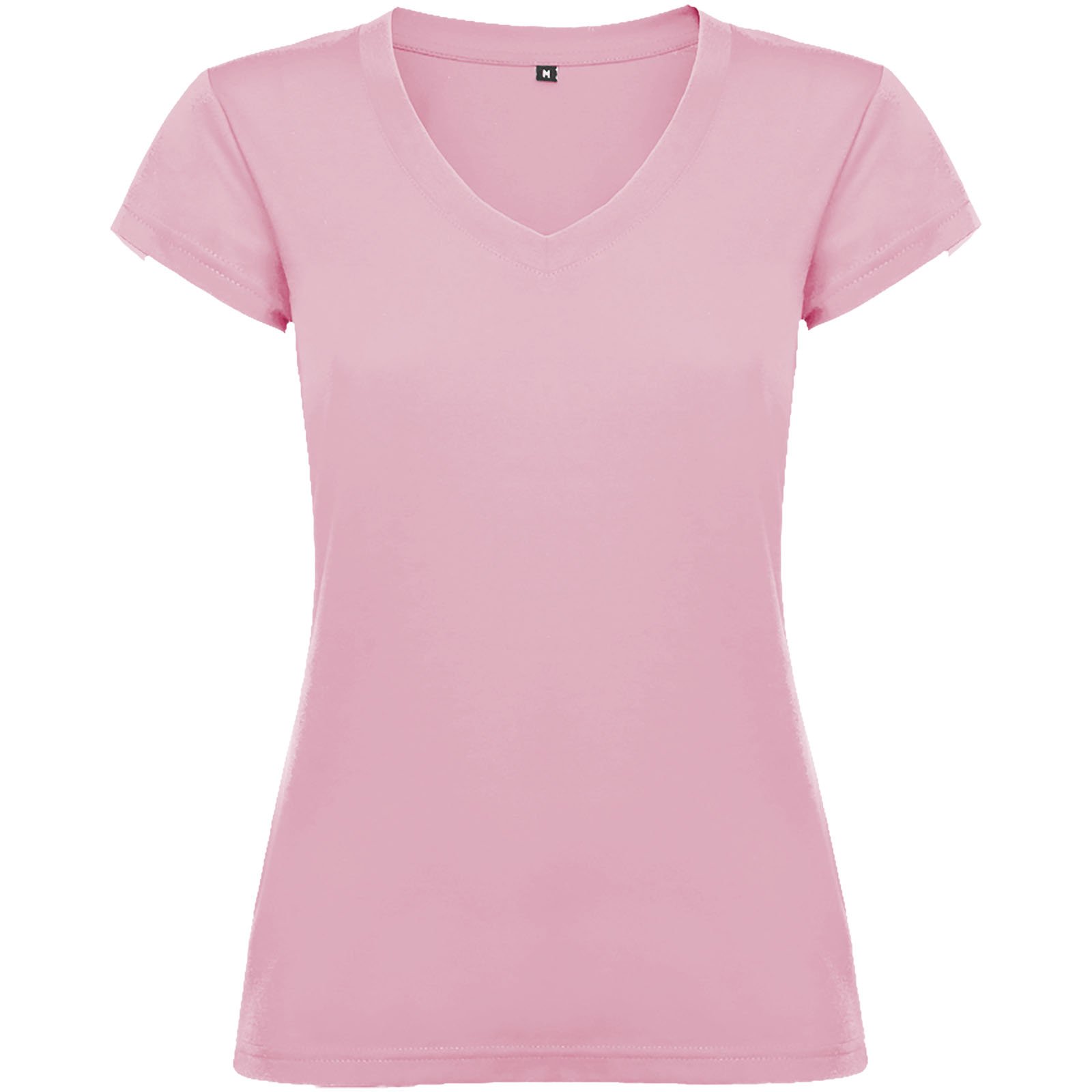 T-shirt col V à manches courtes pour femme avec finitions en côte 1×1. Coupe slim avec coutures latérales. Étiquette détachable. Le mannequin mesure 174 cm et porte la taille S.