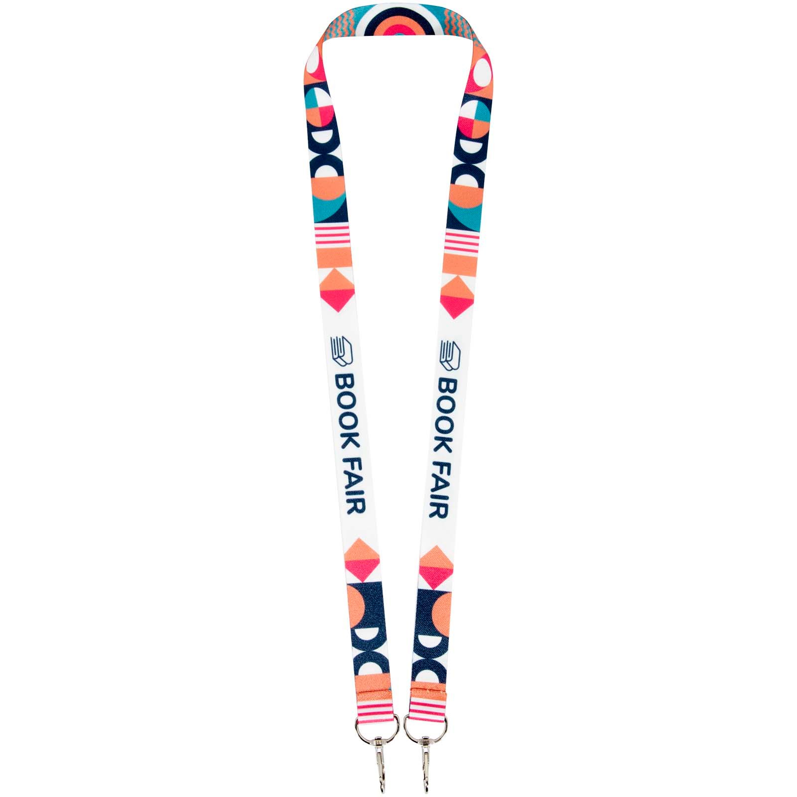 Tour de cou pour sublimation en rPET avec design entièrement coloré et bande en rPET et 2 crochets en métal. Permet d’accrocher un badge nominatif, une carte d’identité ou des clés. Disponible en 4 largeurs différentes : 10, 15, 20 et 25 mm.