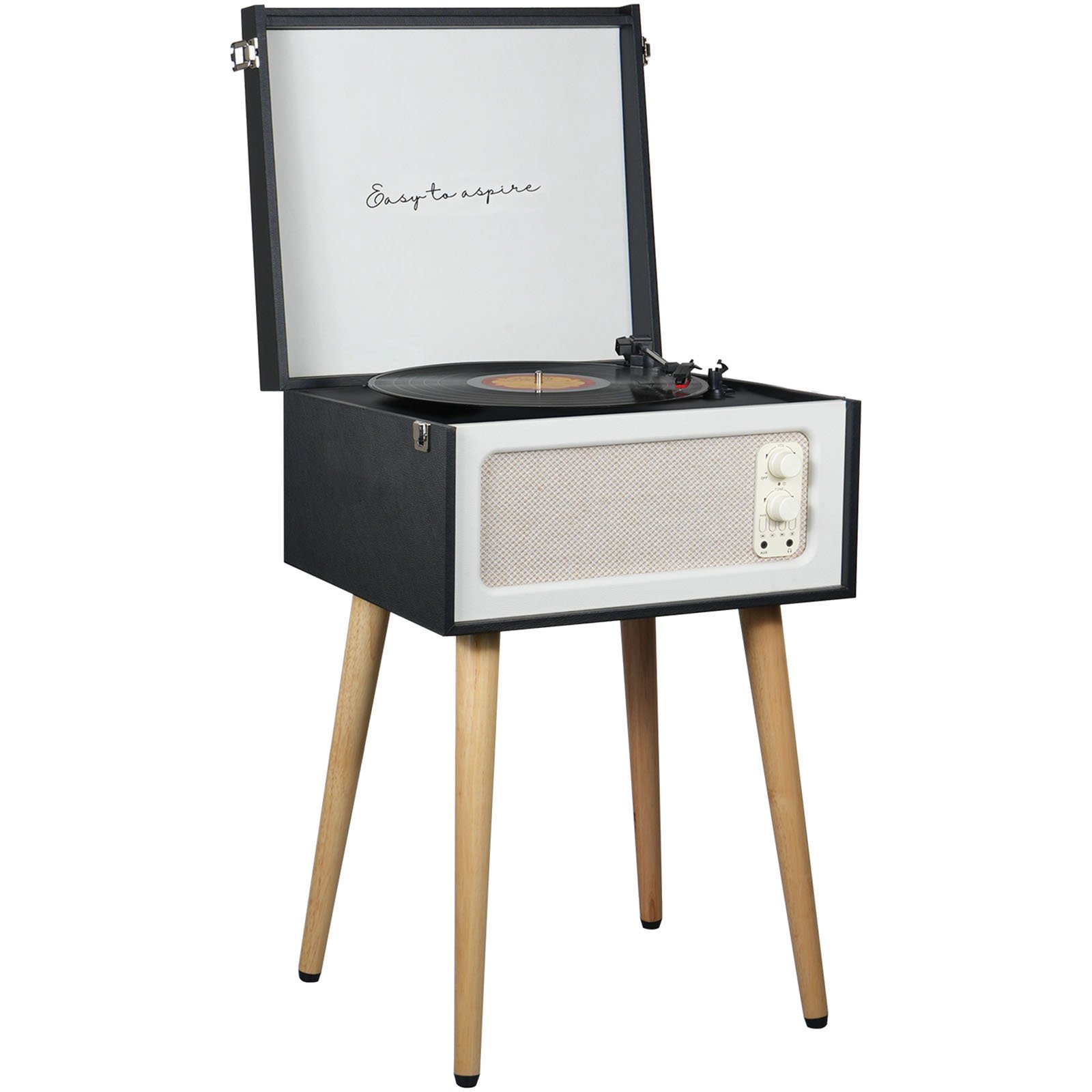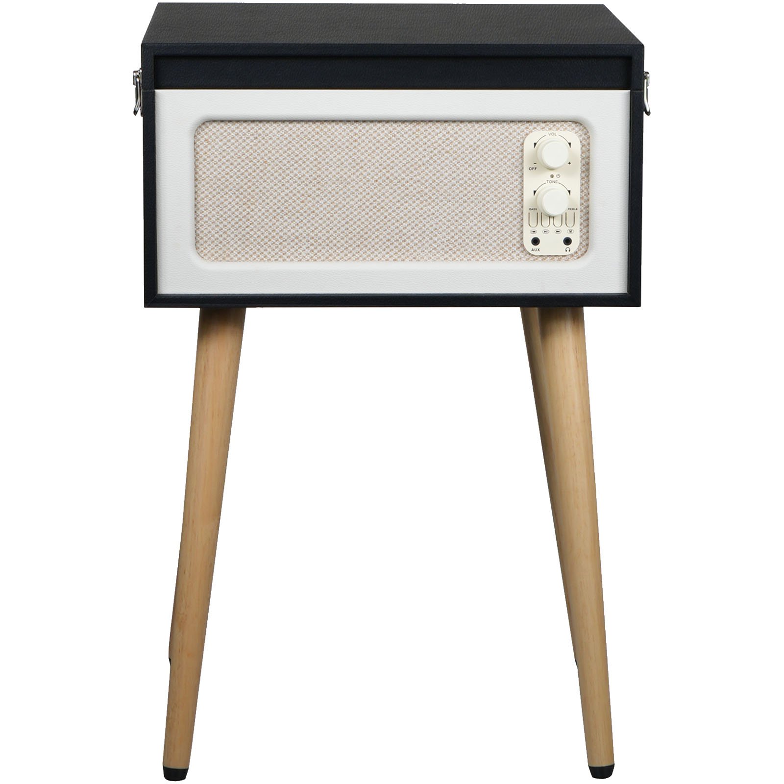 Tourne-disque en vinyle avec 2 haut-parleurs de 5 W chacun. Il dispose d’une radio FM intégrée et d’une connexion Bluetooth® 5.0 sans fil pour lier les appareils et lire de la musique, de 2 sorties audio et casque RCA. Le tourne-disque comprend une aiguille rubis et un couvercle anti-poussière. Design vintage avec pieds en bois.